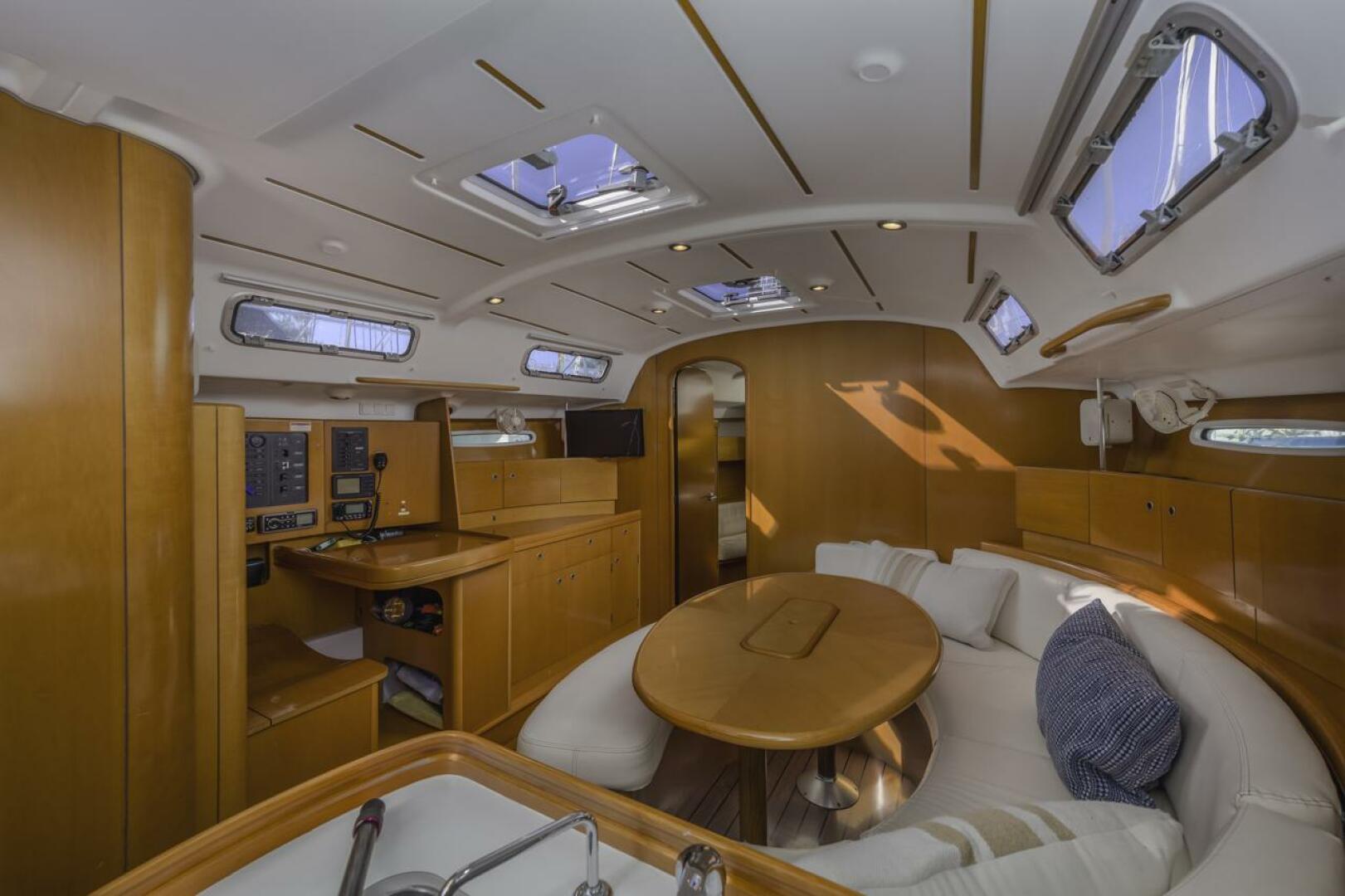 The salon features 6'8" headroom a large dining table (can convert to a large berth) with outboard seating to starboard and bench seating centerline outboard to port large storage cabinet with 3 doors, drawers and shelving with additional cabinets above.