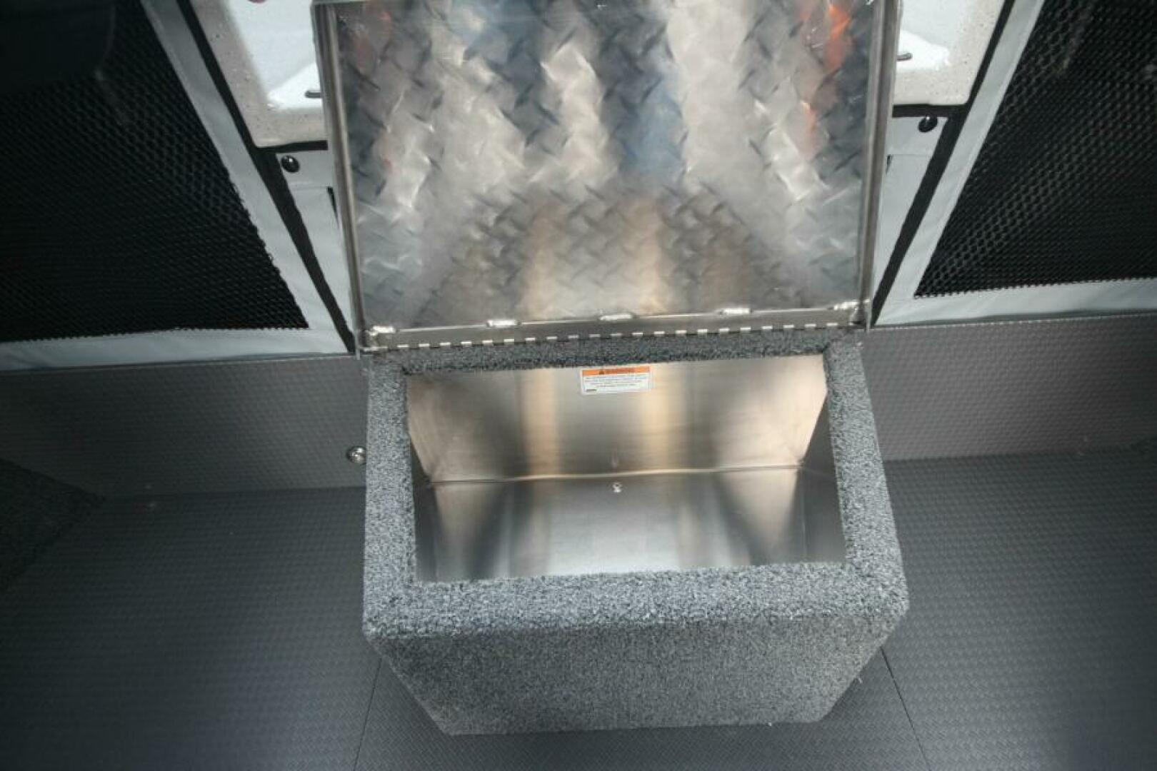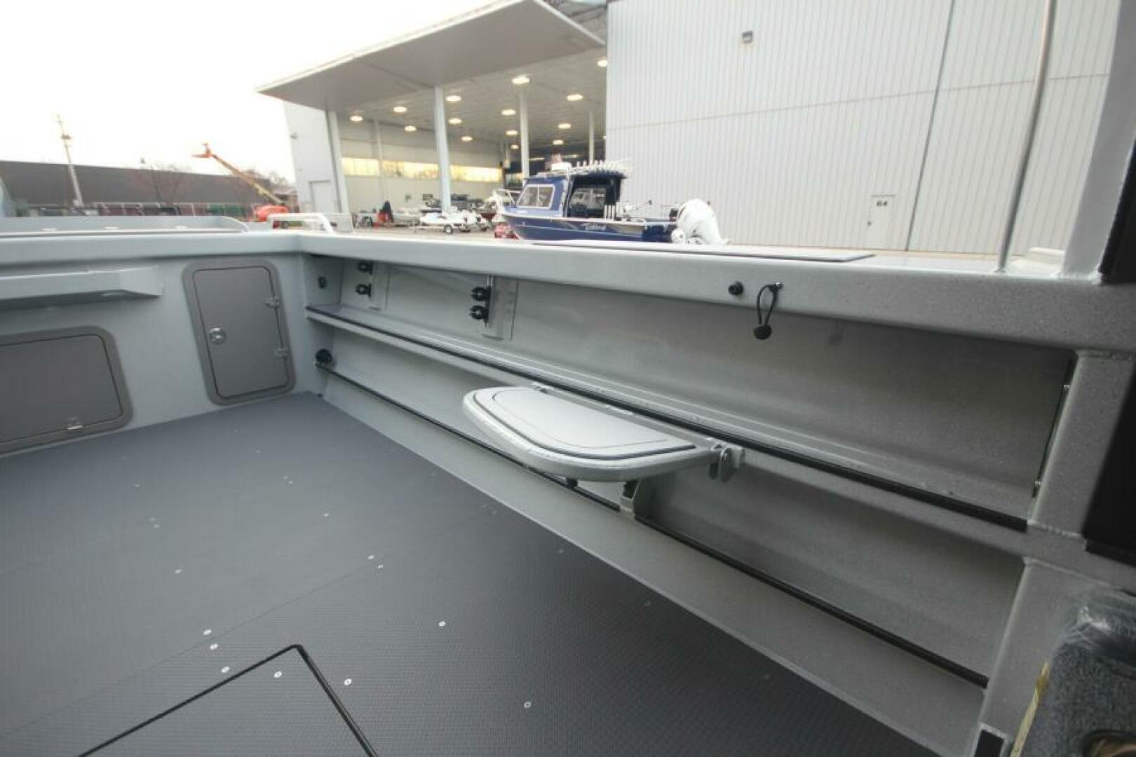 Swept bow design w/ self-bailing recess, 56-gallon bow box, Reel- Tread Decking & 29" safety rails