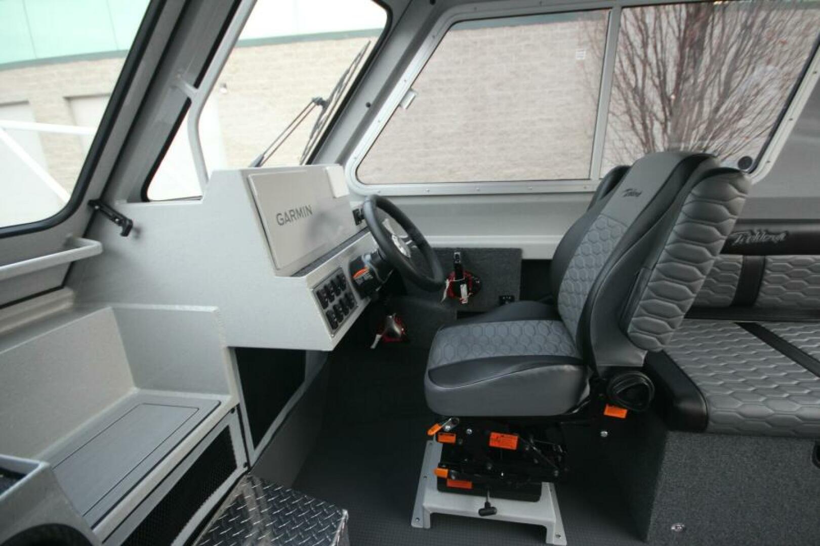 Seafaring hard top (88") w/aft leaning windshield, top trays, red/white LED cabin lights, marine grade aluminum slider side windows, 3" top rails, tread plate roof, & clear vinyl backdrop