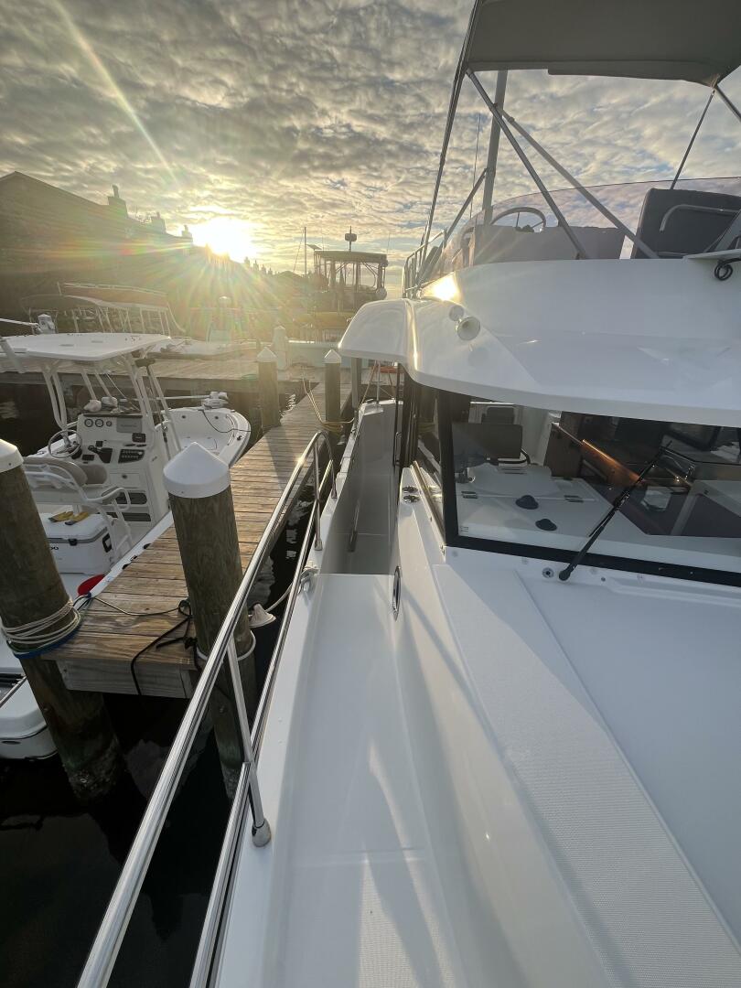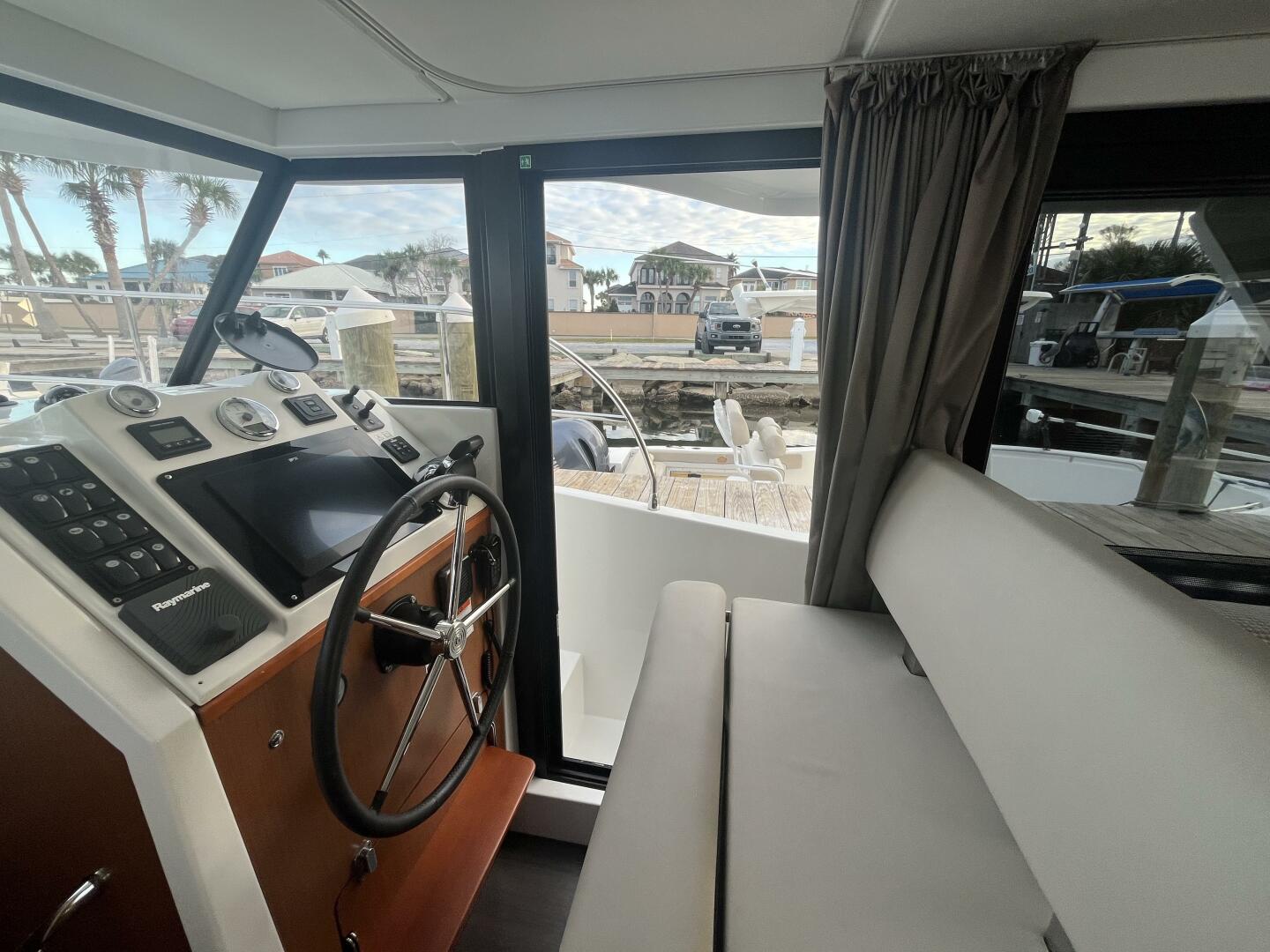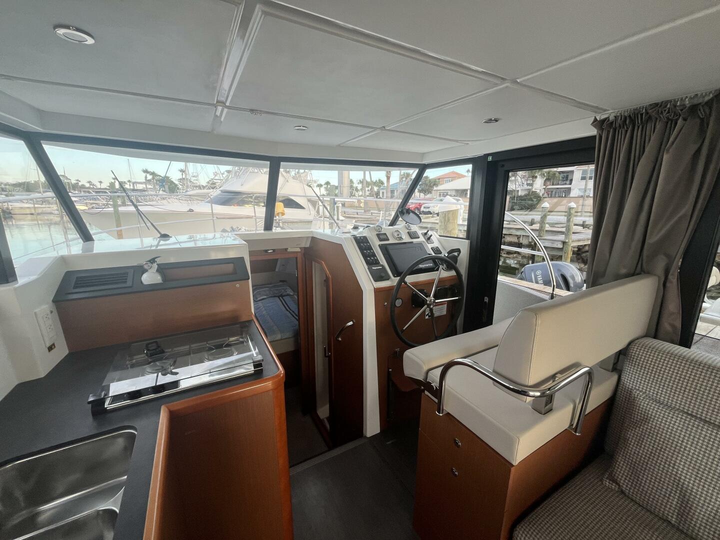 Located to starboard at the forward end of the salon, the helm provides a commanding view through the large, wraparound windows, ensuring outstanding sightlines whether underway or docking. A sliding side door immediately adjacent to the helm opens directly to the side deck, allowing for quick access during line handling or anchoring, and making shorthanded cruising remarkably easy.