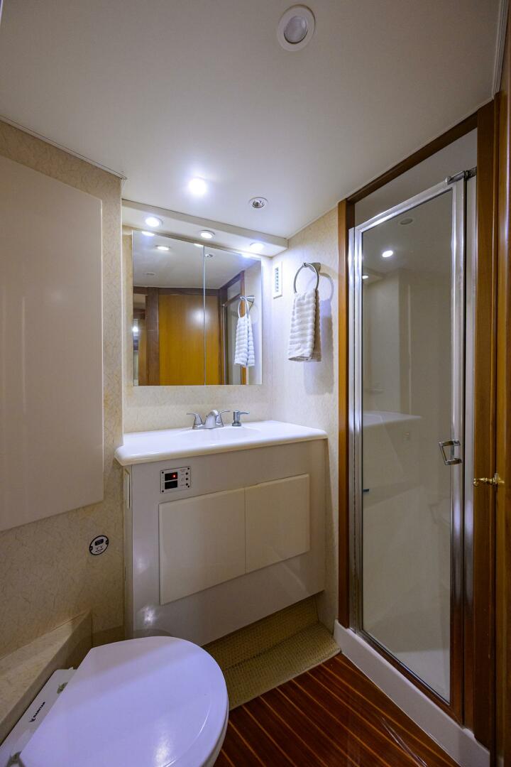 - Stall shower with towel storage