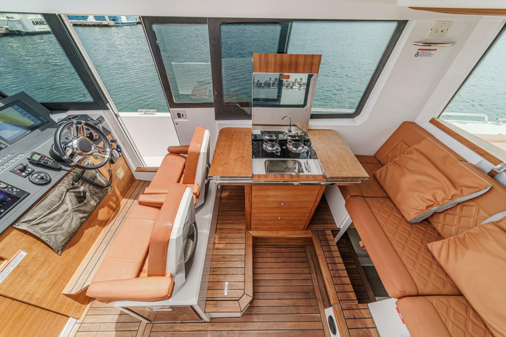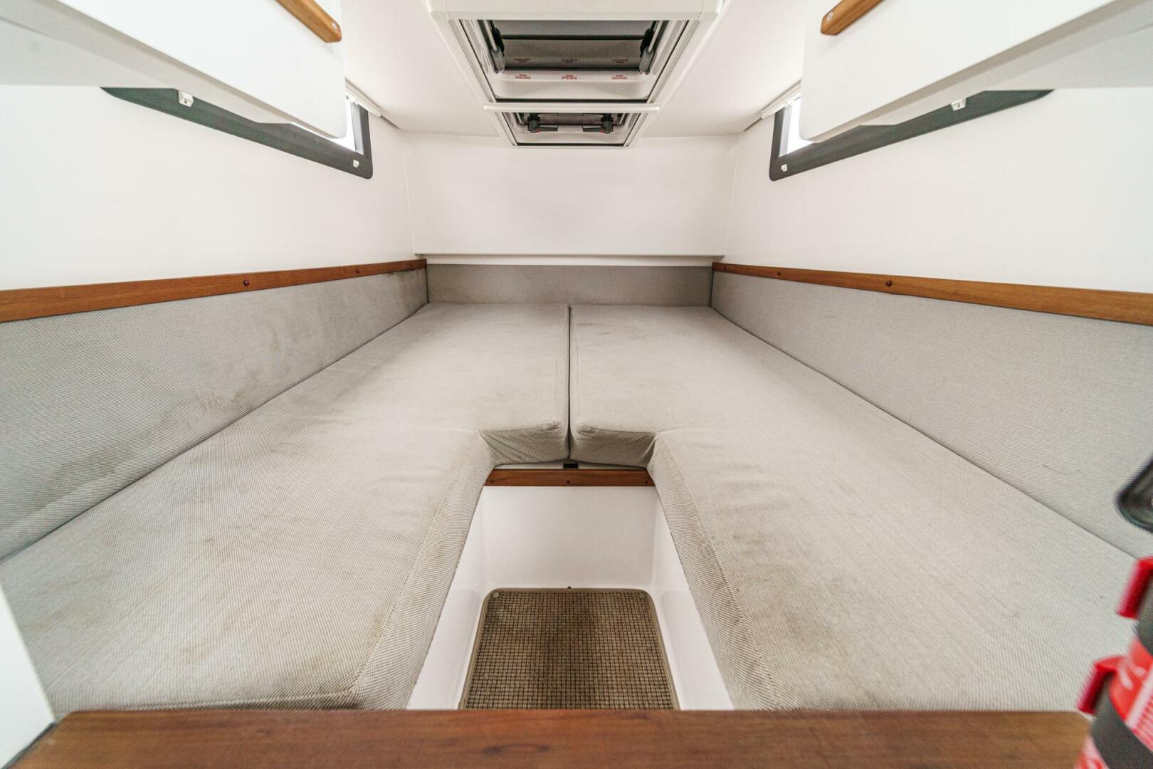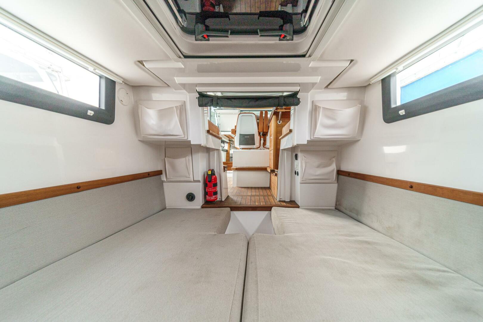 This enclosed cabin has a retractable soft top which makes for perfect for year around boating in most conditions. This Axopar is the 37 Aft Cabin Version, with stove top and dining table aft of the helm. The Cabin up forward is equipped with a bed, storage and head. This provides two private double cabins, one large sleeping cabin aft, and cabin forward with bed and head.