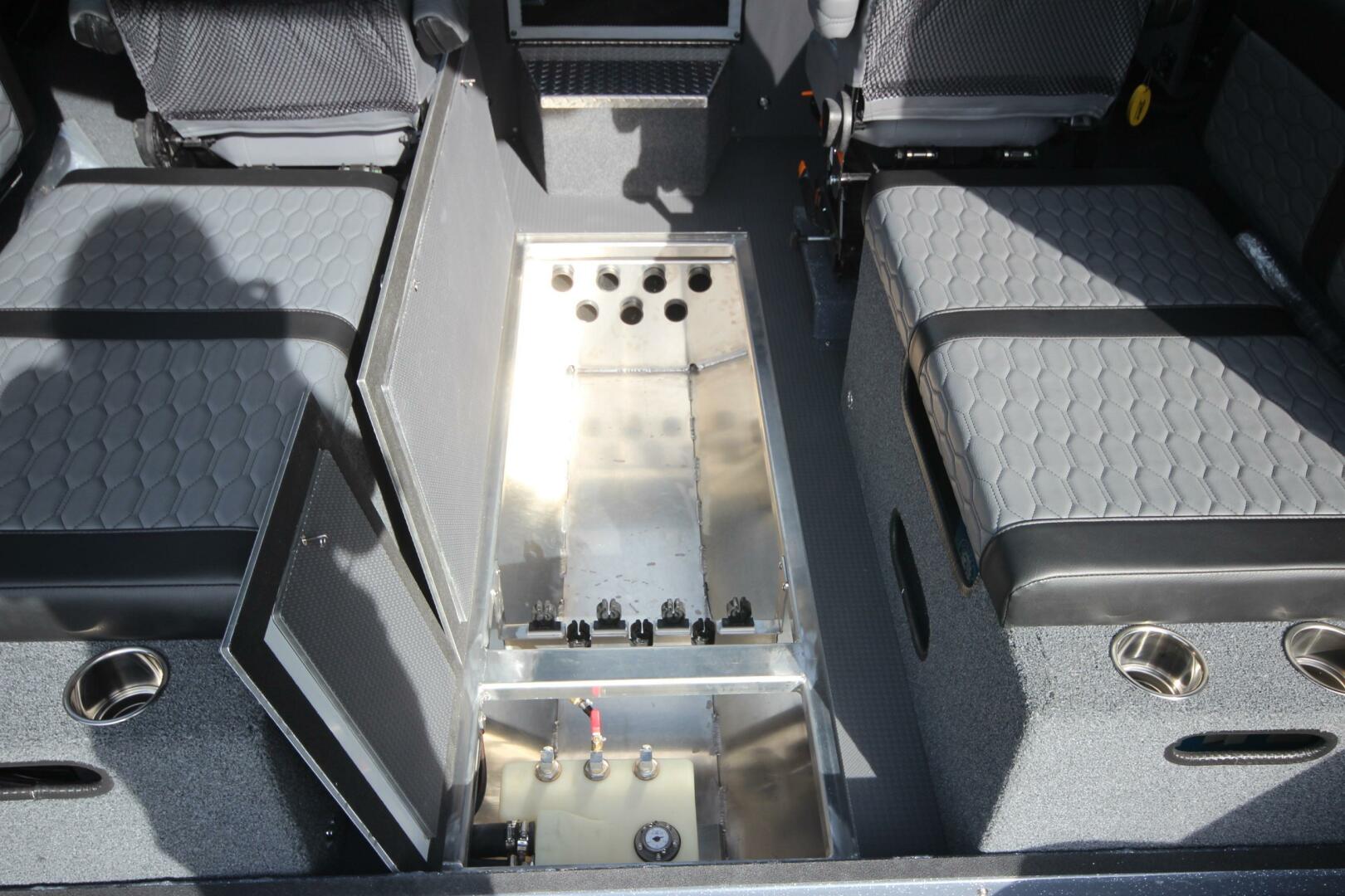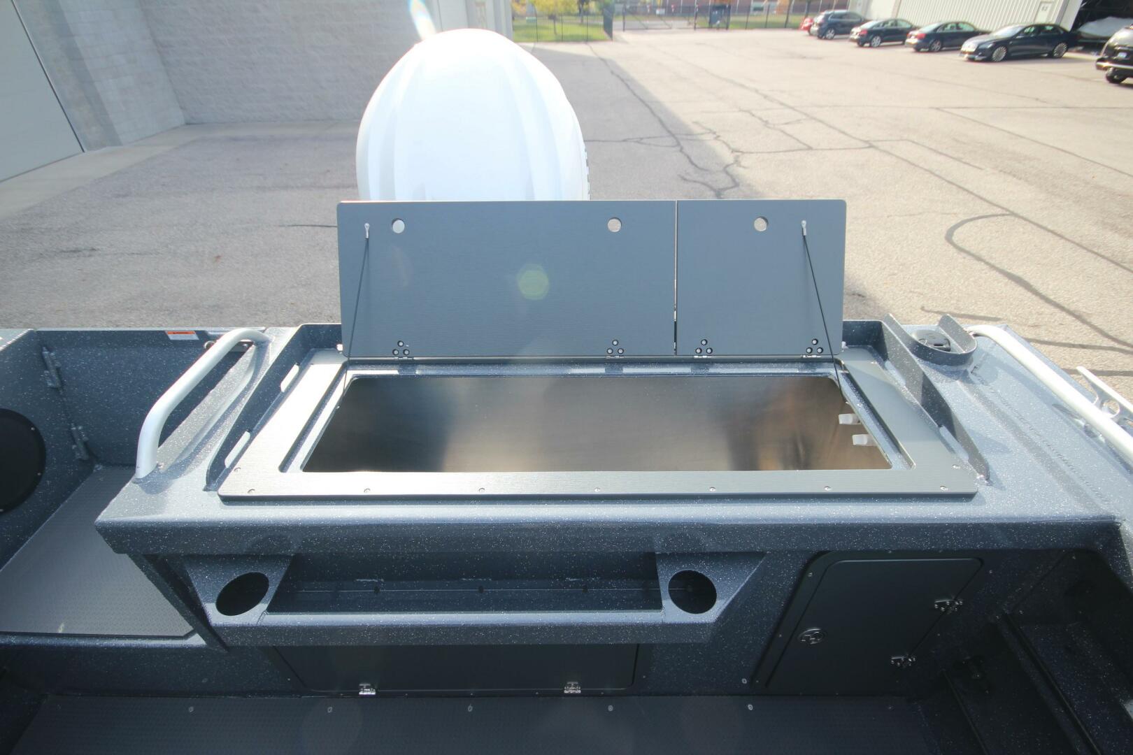Swept bow design w/ self-bailing recess, 56-gallon bow box, Reel- Tread Decking & 29" safety rails
