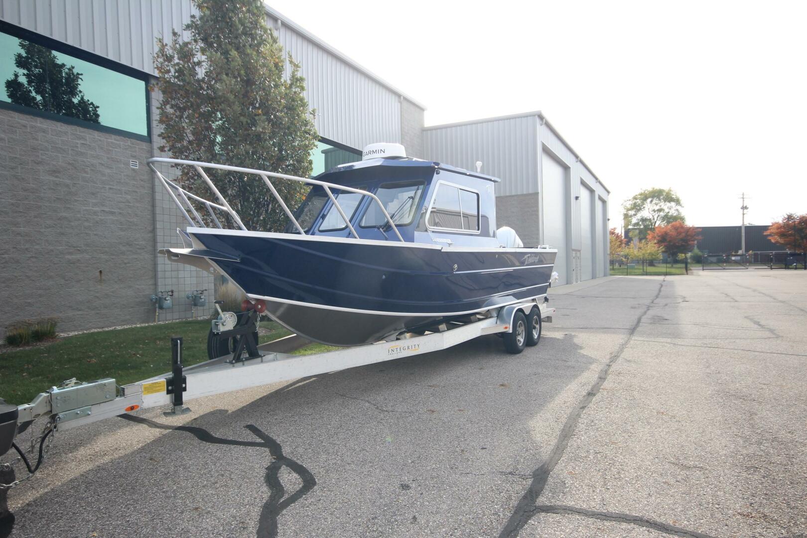 Custom fit aluminum trailer w/ twin 5,000 lb. axles, full bunk construction, hydraulic disc brakes, bearing protection hubs, waterproof LED lighting, waterproof heat shrink connections, carpeted step pads, 15 in. radial tires, aluminum wheels, spare tire bracket and spare tire.