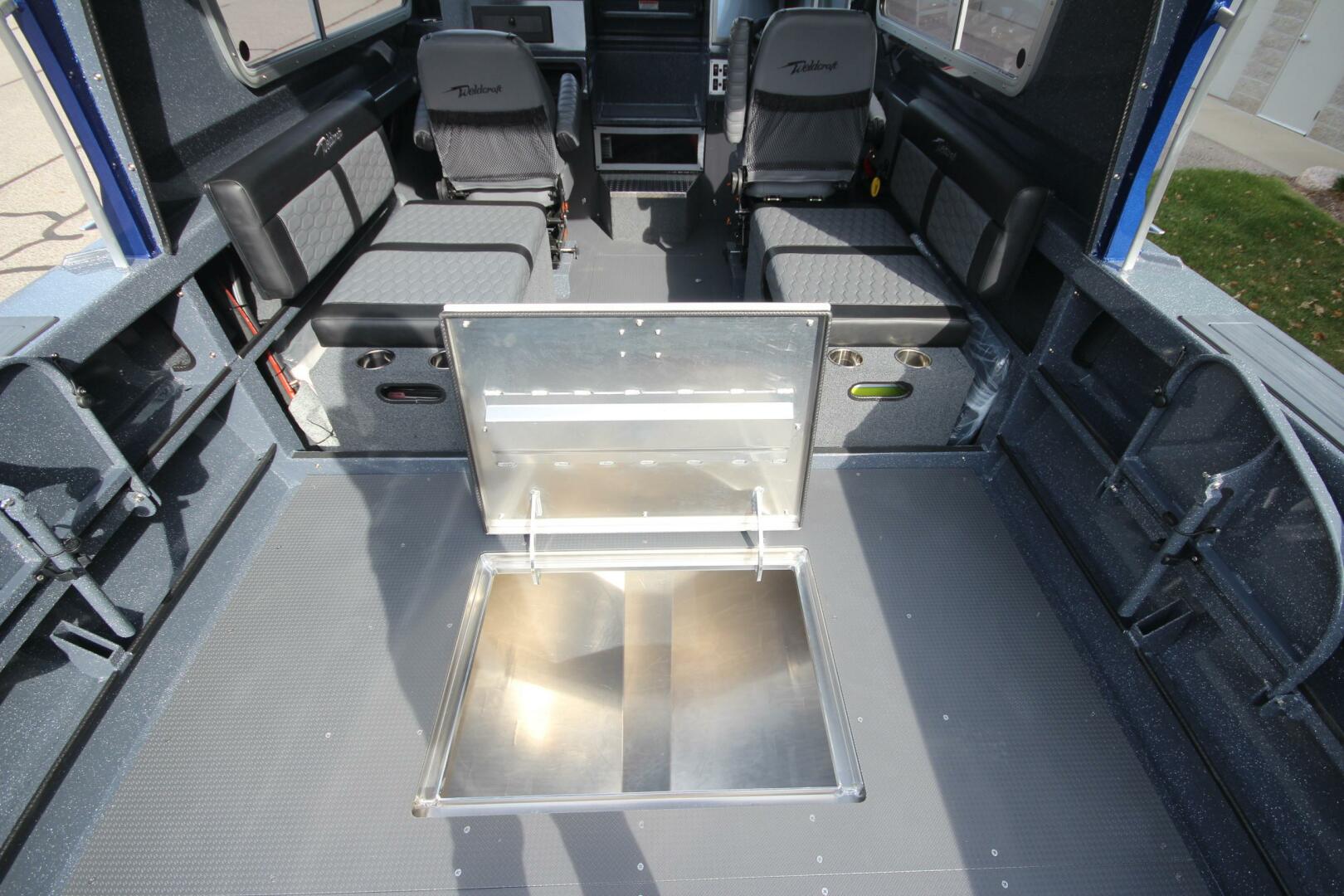 Seafaring hard top (88") w/aft leaning windshield, top trays, red/white LED cabin lights, marine grade aluminum slider side windows, 3" top rails, tread plate roof, & clear vinyl backdrop