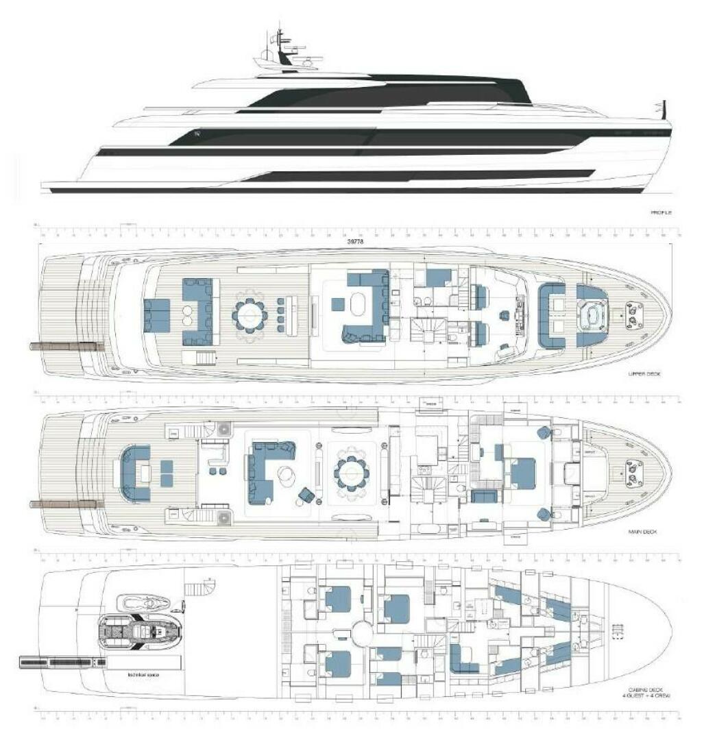 • Aluminum superyacht with a modern long-range design and impressive volumes • Private use and VAT paid • Infinity Jacuzzi on the foredeck • 5 cabins for 10 guests, including a master suite on the main deck • Fin stabilizers both underway and at zero speed