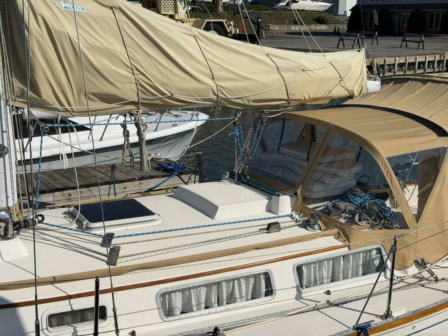 Tankage includes approximately 38 gallons of freshwater and about 20 gallons of fuel, giving the boat solid cruising range and convenience for weekends aboard. The boat features a very nice full canvas package—recent bimini, dodger, and connector—providing protection and extended cockpit comfort. Newer instruments round out the helm area, offering clear, reliable navigation and sailing data.