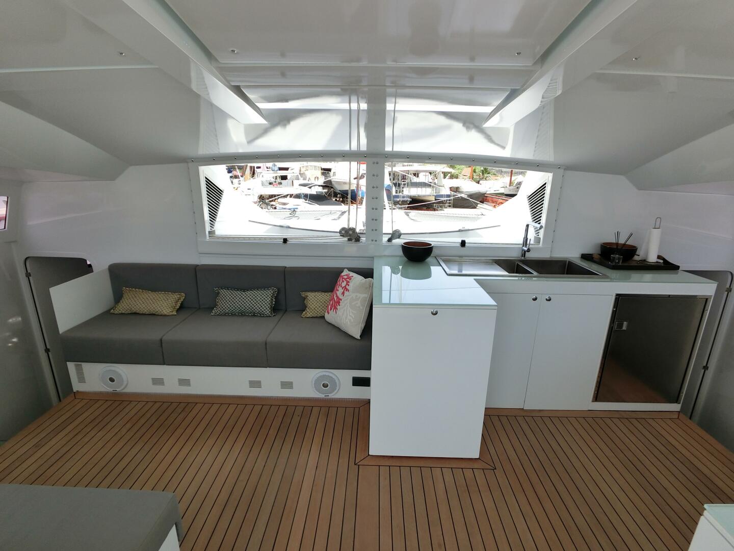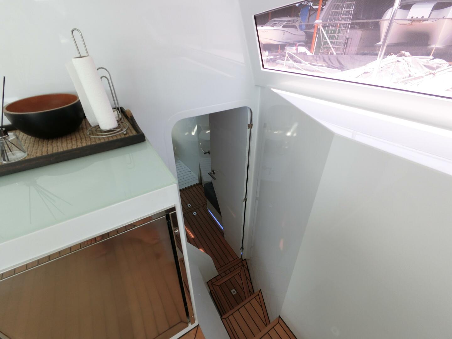 The nearly full-width saloon and galley feature innovative drop-down front windows, allowing a refreshing breeze to flow through even on the hottest days. Alternatively, close up and enjoy the comfort of full air conditioning. The well-designed galley to starboard includes deep slide-out drawers, ample storage and excellent refrigeration, with additional fridge/freezer space to port for longer passages.