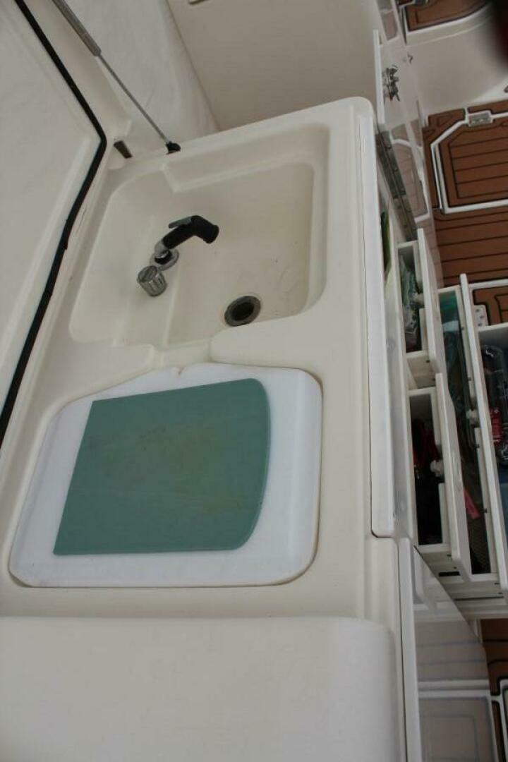 Below deck, the air-conditioned cherrywood interior includes a well-equipped galley, U-shaped settee that converts to a double berth, and a forward V-berth stateroom. The spacious head features a vanity with sink and a separate stand-up shower.