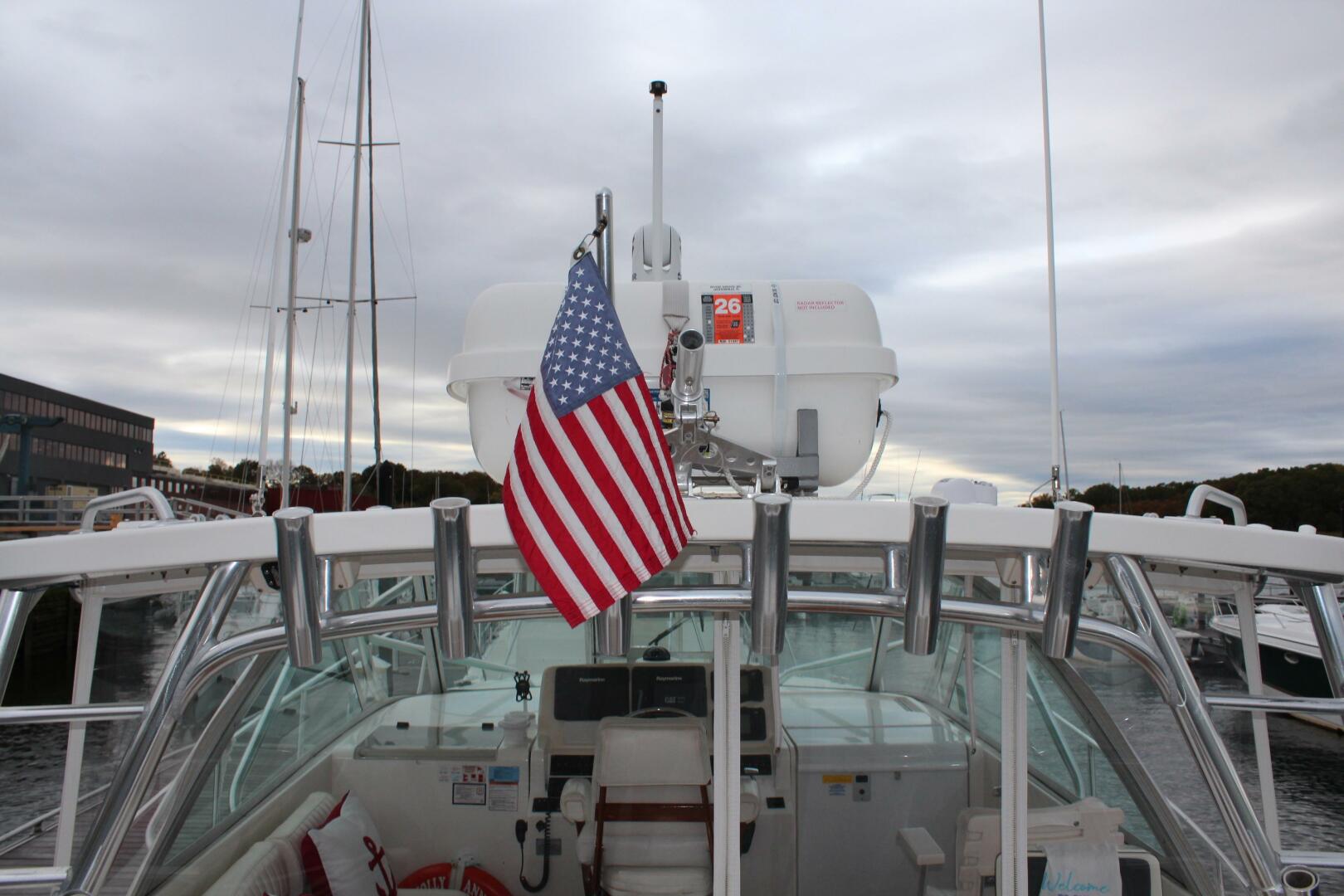 The cockpit is designed for serious anglers, featuring port and starboard fish boxes, a built-in tackle center with sink, cutting board, drawers, and cooler box, along with a rocket launcher, 24 rod holders, large livewell, and swing-out transom door. A full suite of Raymarine electronics along with Furuno GPS and autopilot provide confident navigation.
