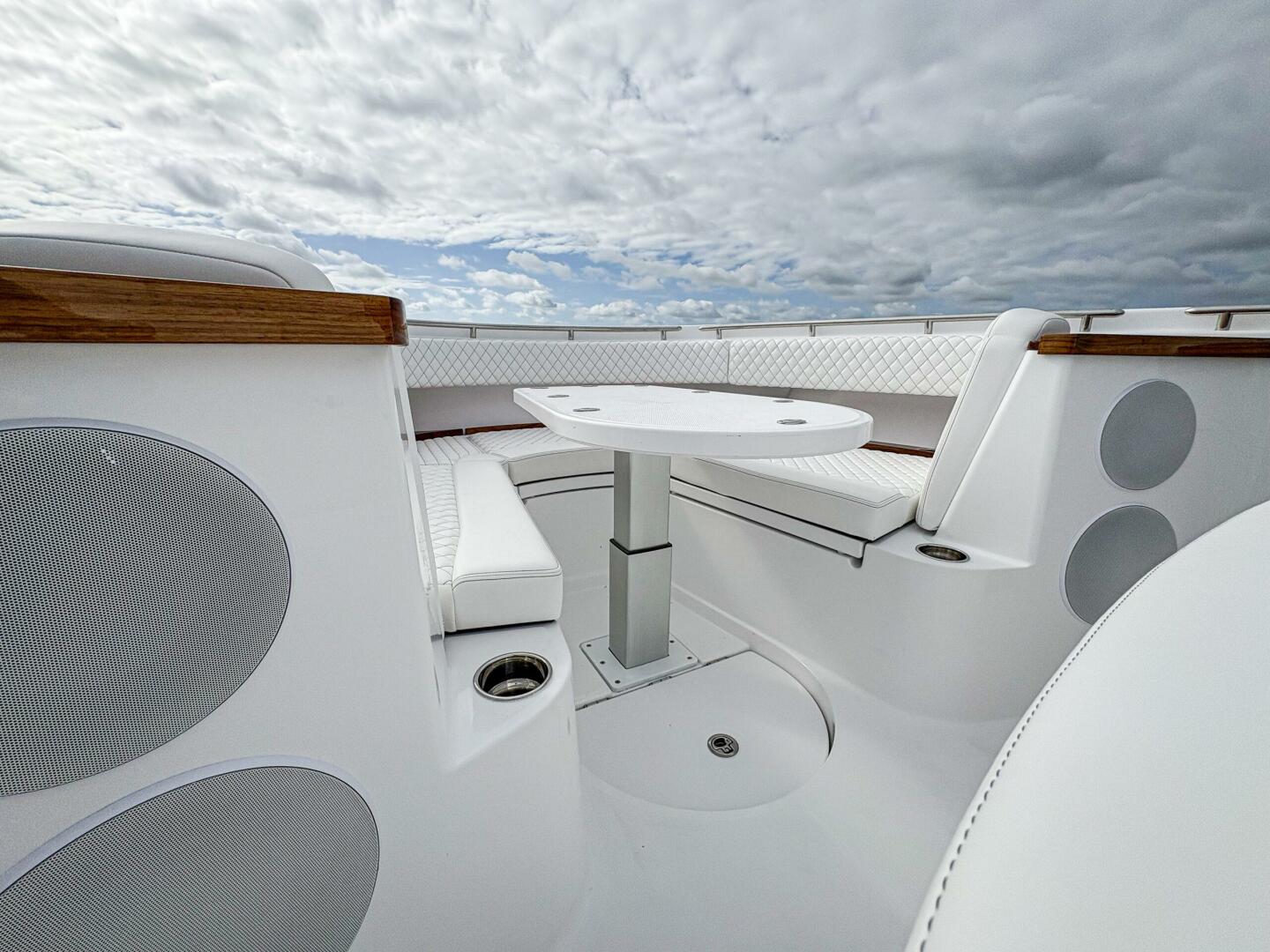 - Forward console lounge seat with contoured backrest with removable center armrest, cup holders (2) and Port/stbd storage compartments w/usb chargers