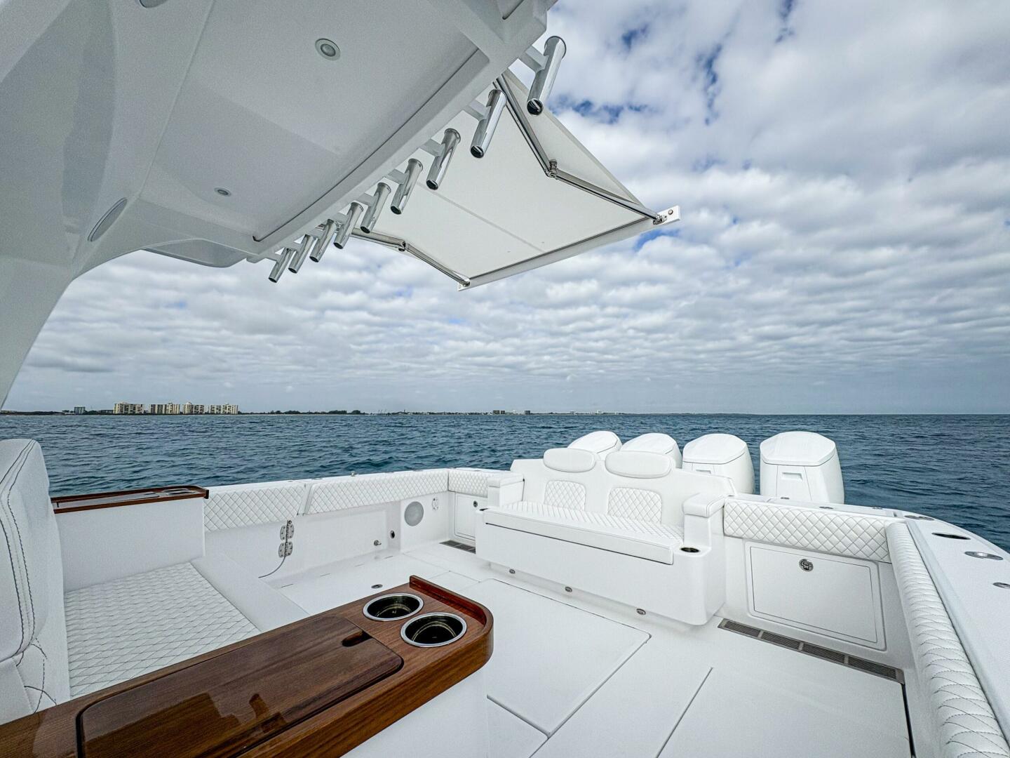 - JL Audio Luxe flush-mount sound system, electronic sun shades, Bentley-pattern upholstery, abundant refrigeration, and tournament-grade baitwells and rod-holder upgrades.