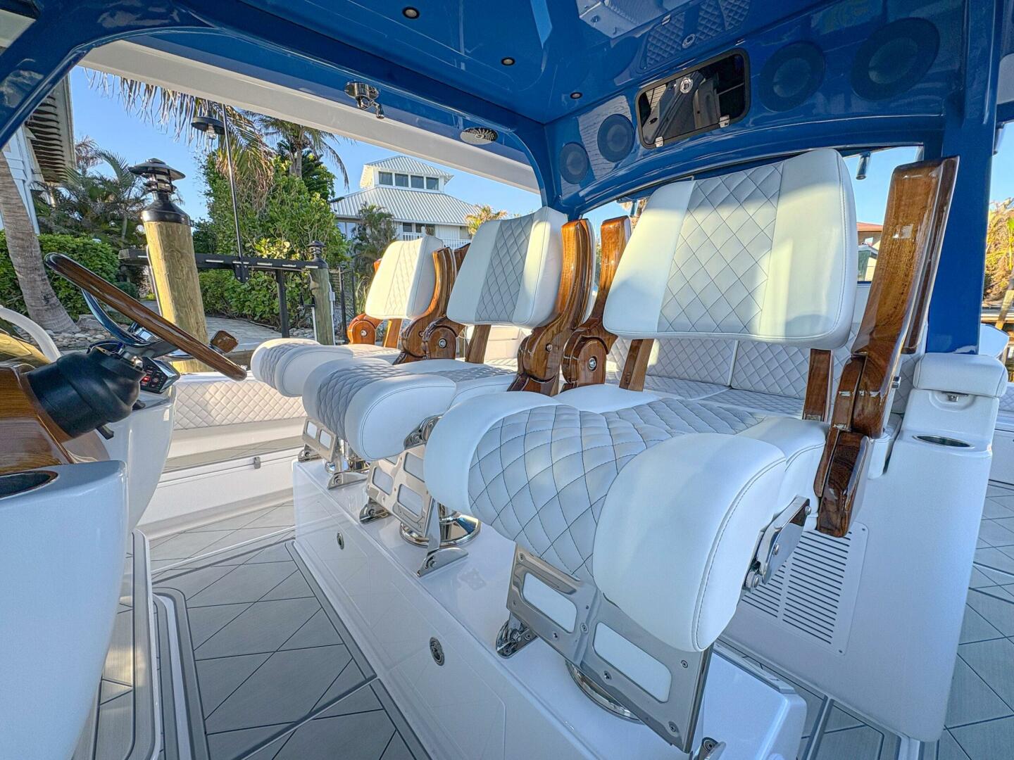 - Release Marine triple helm seats with teak ladder backs & armrests