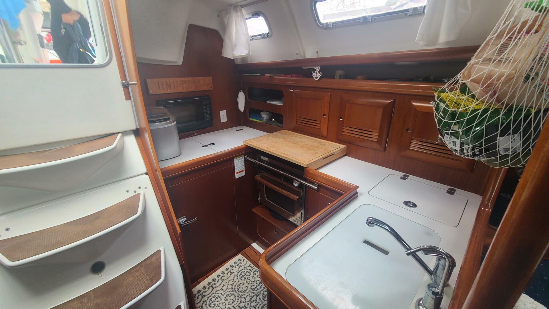 Seeress is the two-cabin version, with a forward cabin with a private head, an aft cabin, and a second head, her galley in a traditional portside nook next to the companionway, with a settee to starboard opposite the dining area;