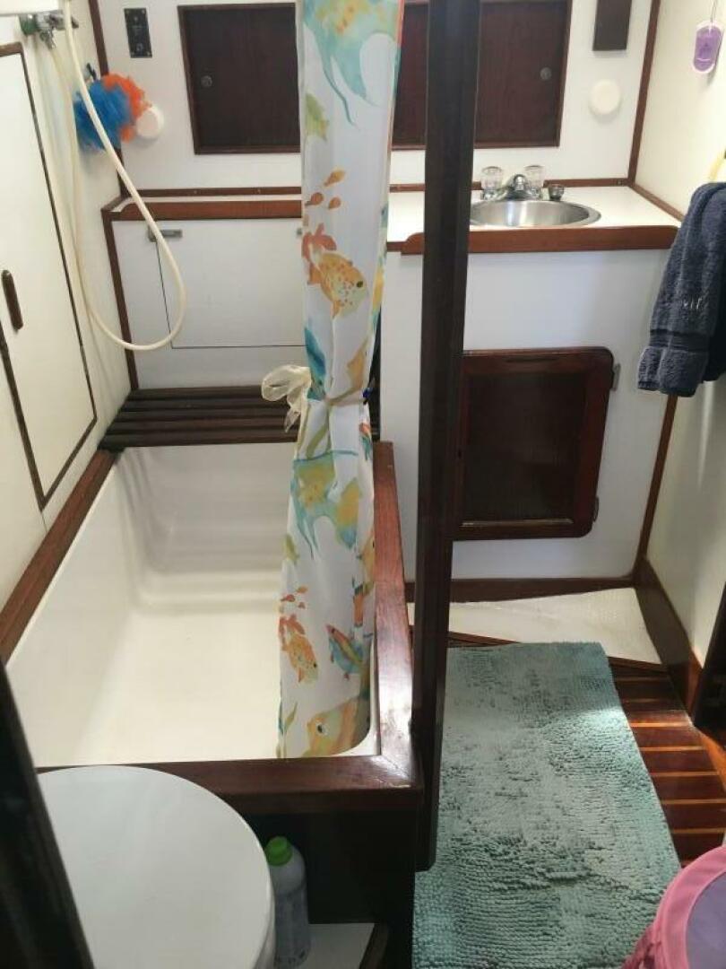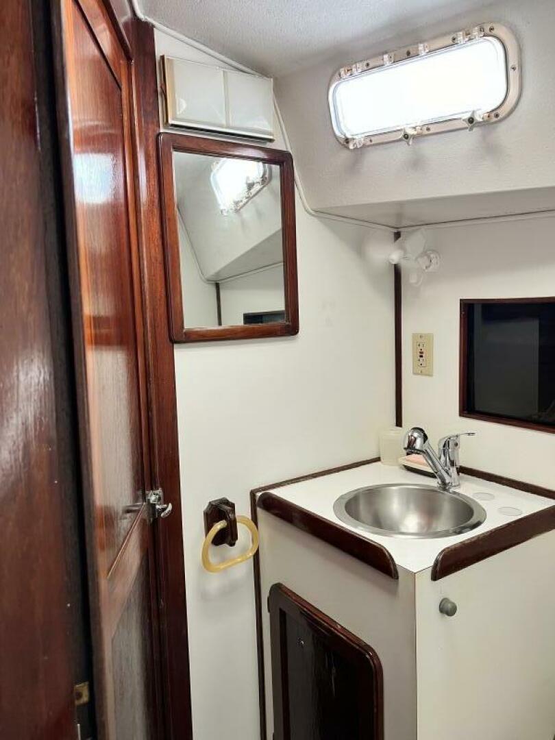 Longevity is exceptionally comfortable under sail, with a notably sea-kindly motion. Her expansive cockpit enhances both cruising enjoyment and onboard living. Numerous portlights and hatches provide excellent ventilation, keeping the interior cool in warm climates. The tub offers a generously sized showering area as well as a practical utility basin for rinsing wetsuits and other gear.