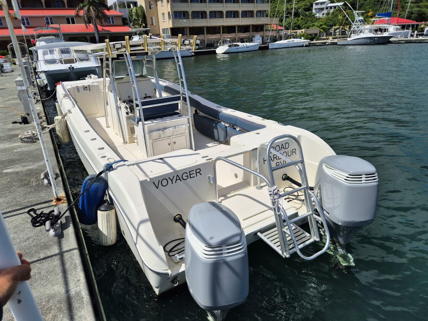 This World Cat 330 TE 'Voyager' is fully imported to the BVI and rated for 14 passengers fopr charters in the BVI. It features extra retractable bench seating and was re-powered in 2013 with twin Suzuki 300HP engines (just over 1,000 hours, freshly serviced, and repainted). With the head compartment port forward and large compartment to starboard, extra retractable bench seating along with the coffin box style forward seating, 'Voyager' would make for a great day charter, fishing and/or water taxi boat. Turnkey charter machine—ready to generate revenue!