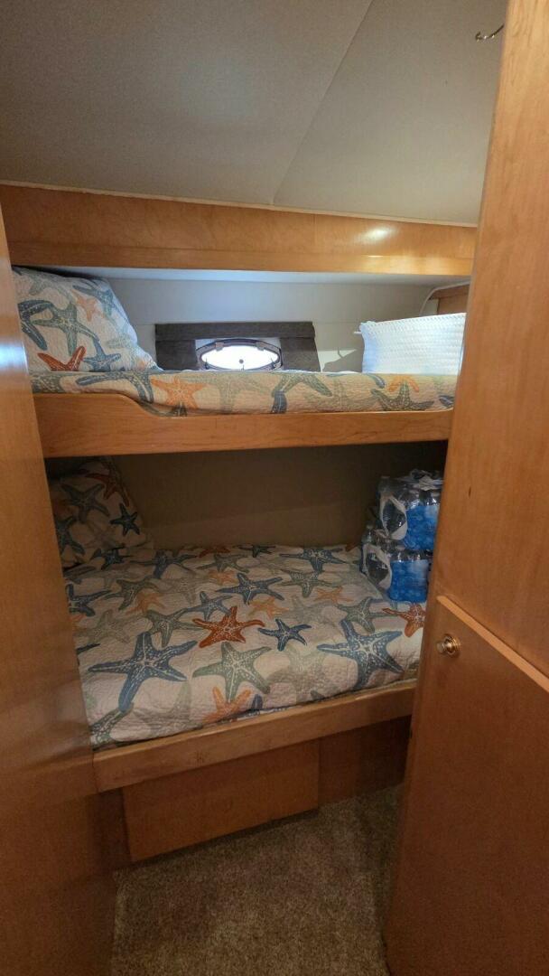 The portside guest stateroom features upper and lower bunks, hanging locker, reading lights, and a portlight. This space is ideal for additional guests, kids, or grandkids and adds real flexibility to the sleeping arrangements aboard Toes in the Water.