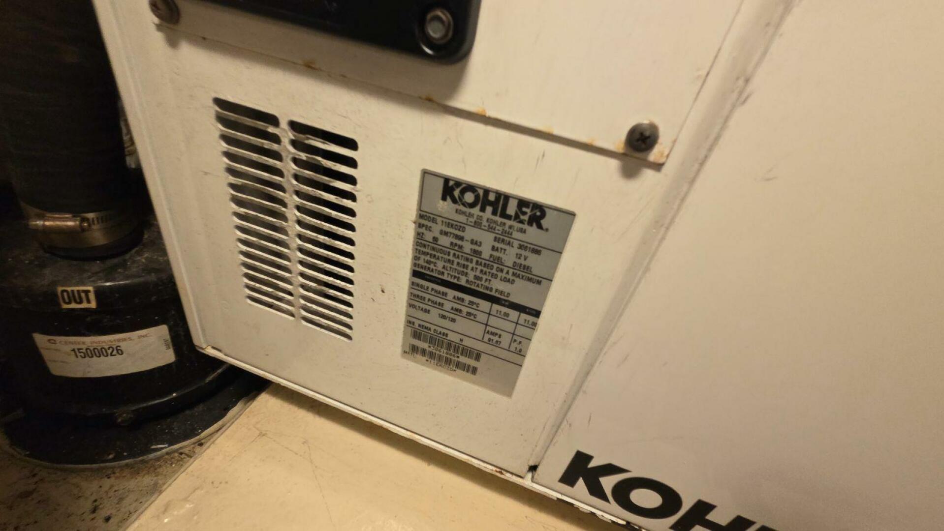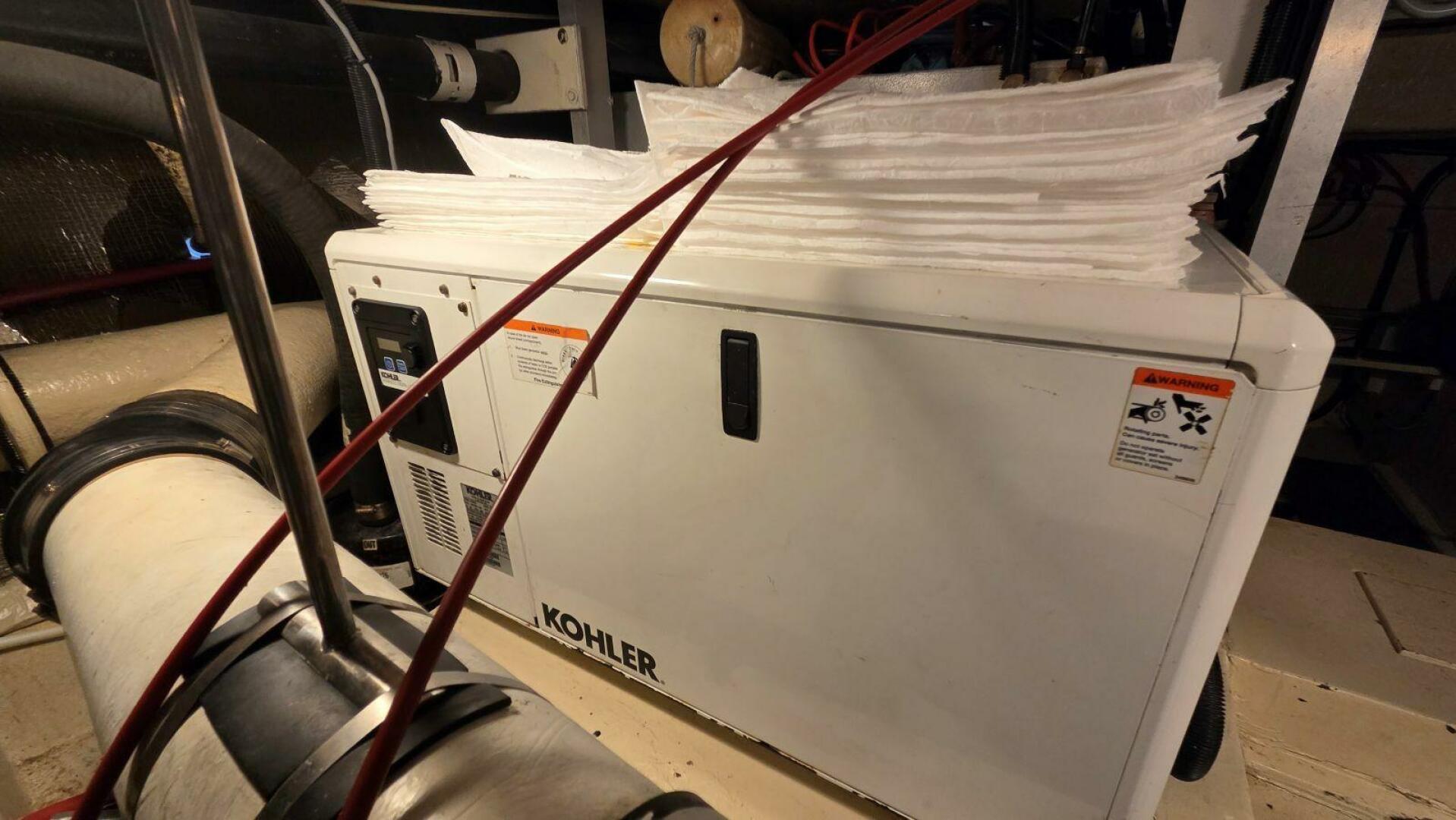 An Onan 11 kW generator (installed new in 2012) shows approximately 473 hours and has been well maintained. Aluminum fuel tanks hold approximately 300 gallons each, bronze rudders received new packing in 2020, and the vessel is equipped with five air conditioning units, many replaced between 2014 and 2025. A bottom job with antifouling paint was completed in November 2025.