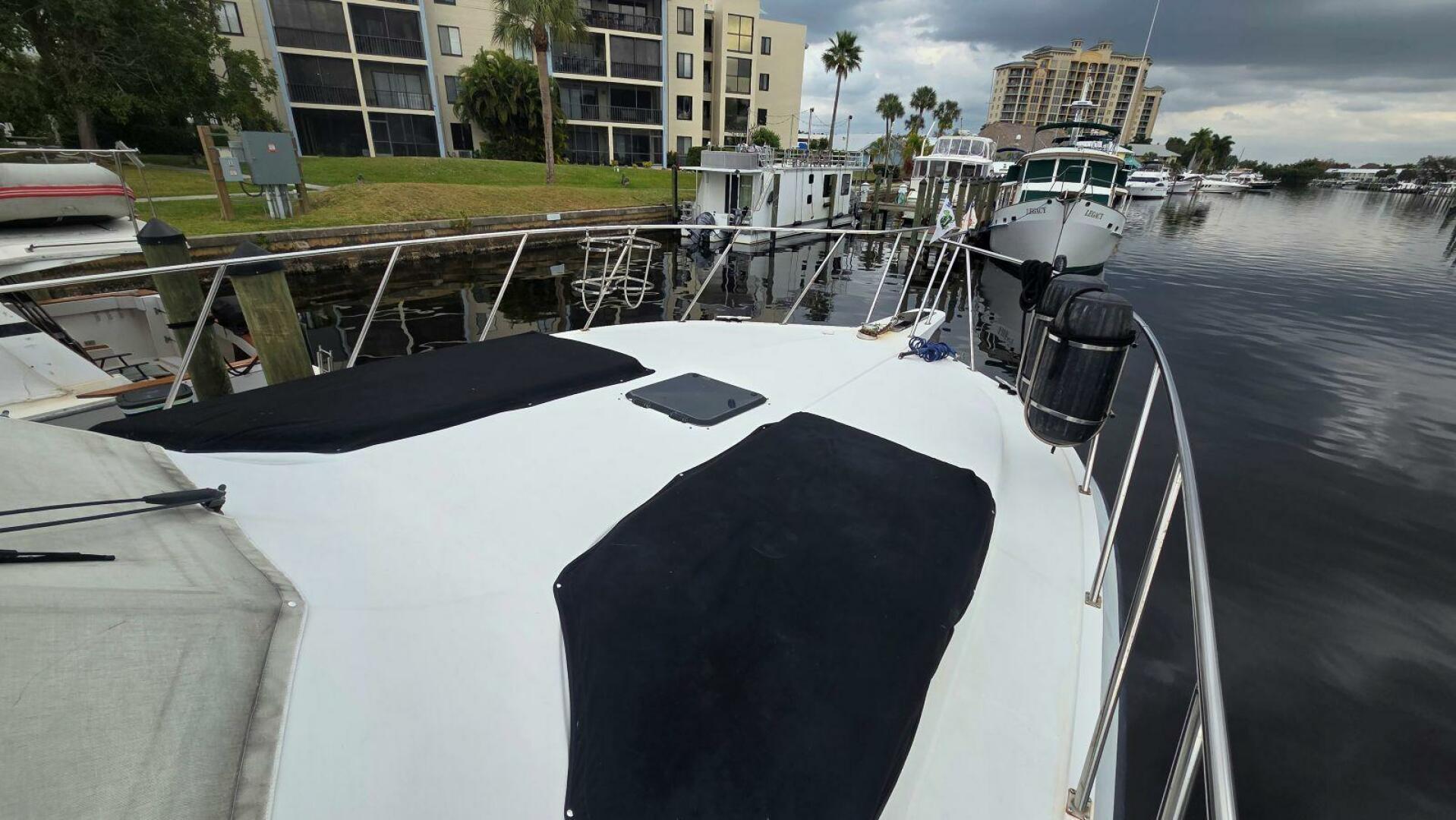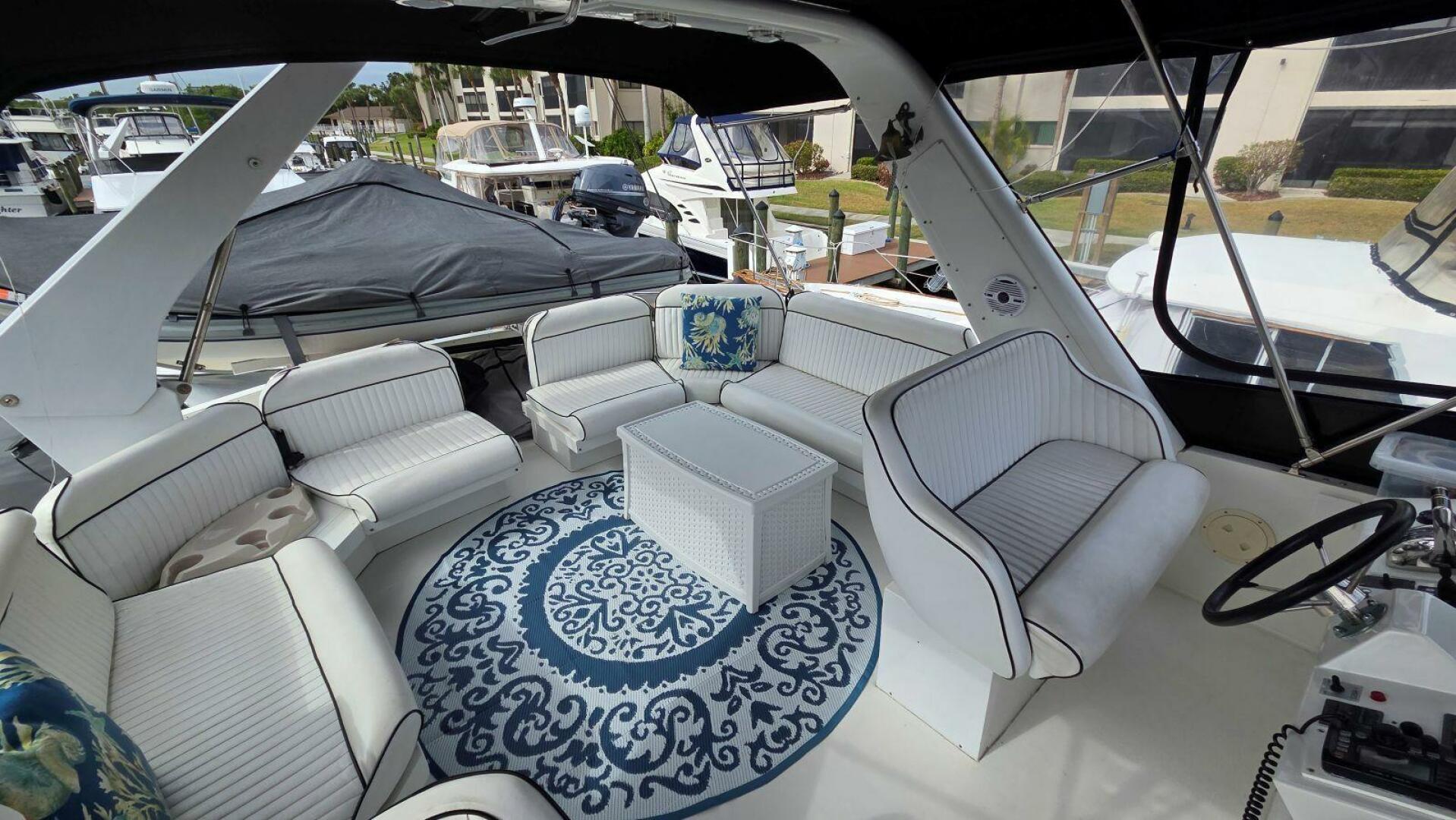 The flybridge is accessed directly from inside the pilothouse and offers excellent visibility and seating for a crowd. Wraparound lounge seating aft of the helm creates an inviting space for entertaining, cruising on nice days, or simply enjoying the view. The bridge vinyl was replaced in 2016 and continues to present well.
