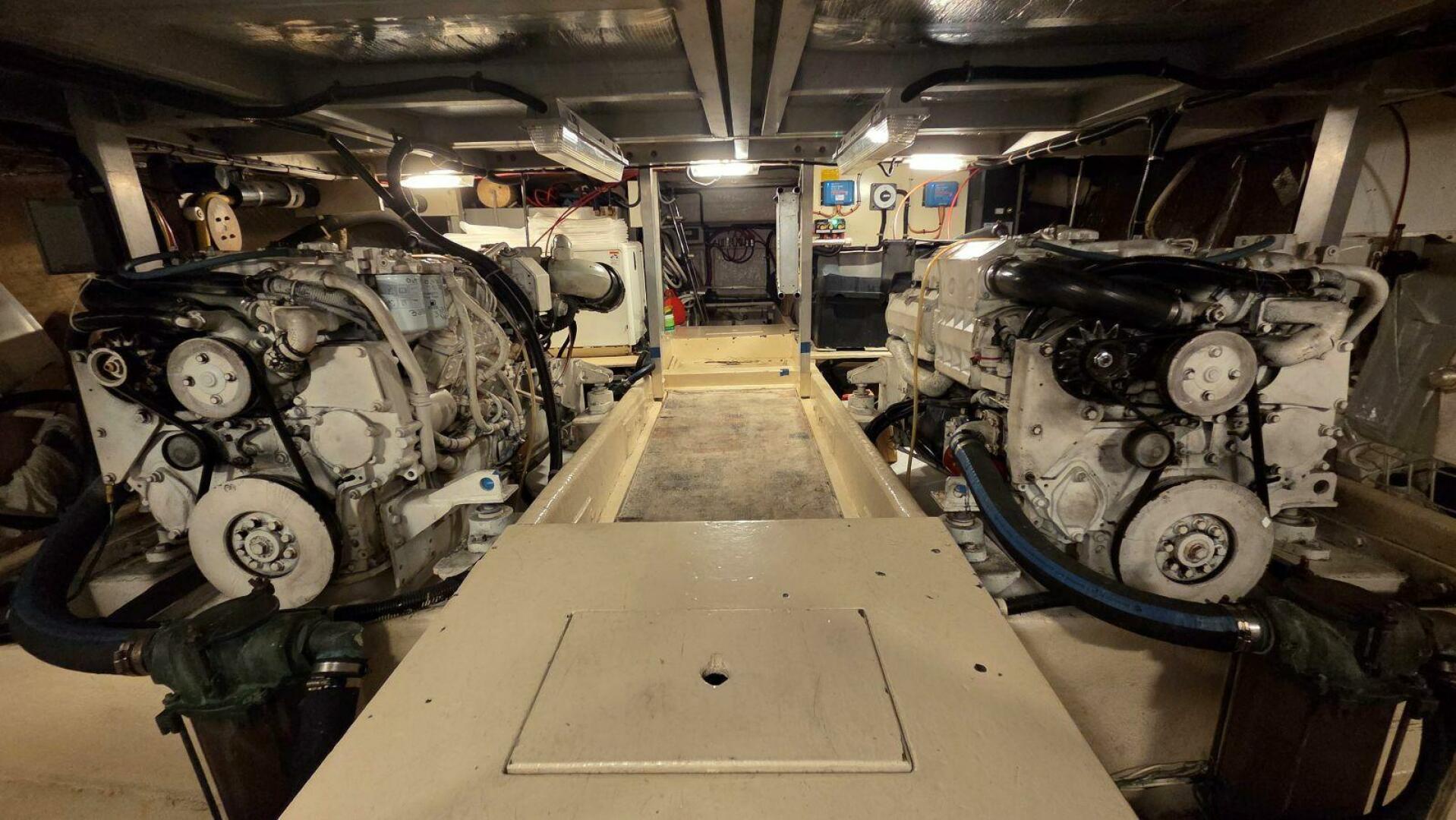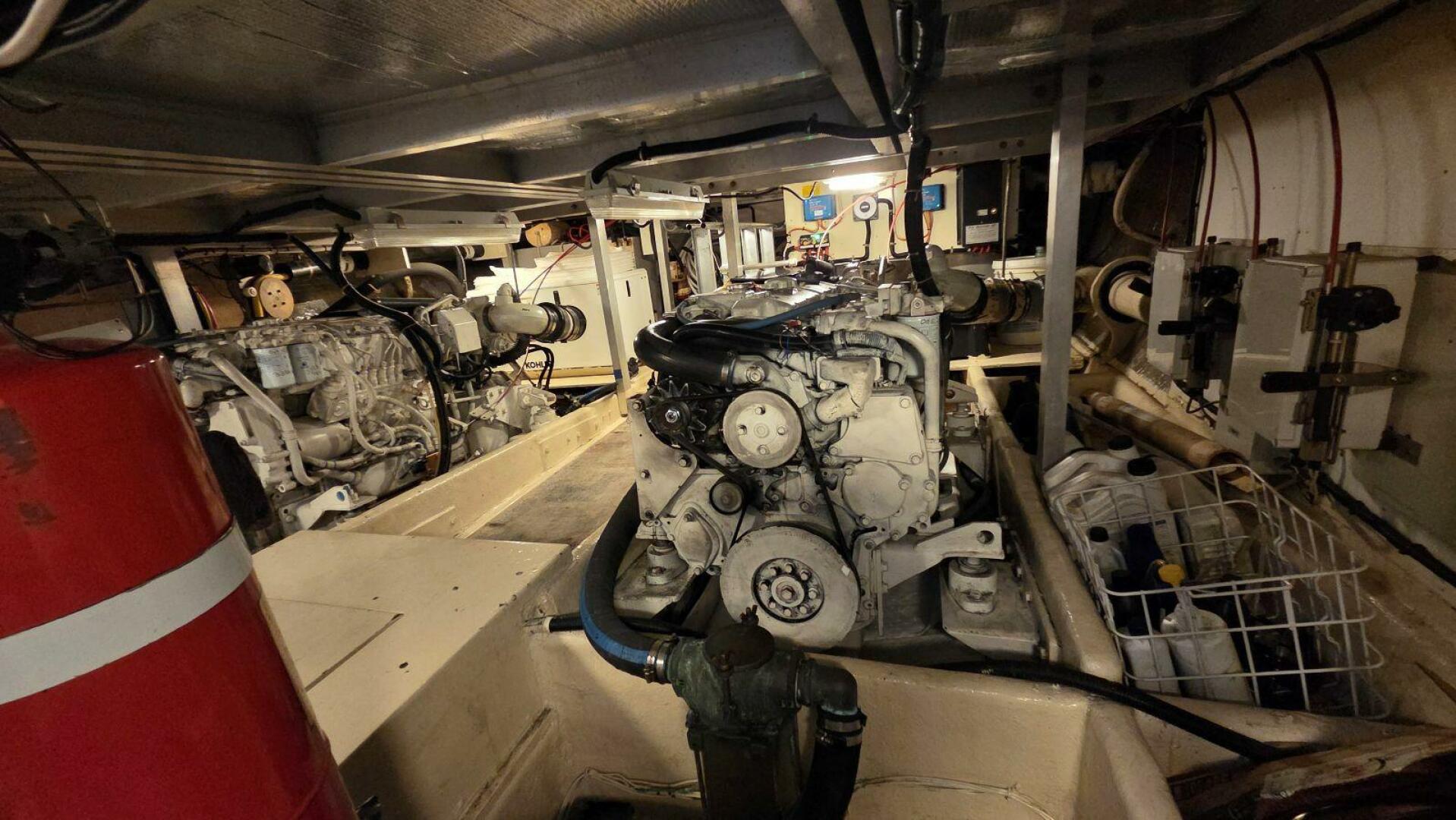 Power comes from twin Volvo Penta TAMD63P 370 HP diesels with approximately 3800 hours. These engines have seen significant recent investment, including new turbos installed in 2025, exhaust elbows replaced in 2024, a new alternator on the port engine in 2026, and a new starter on the starboard engine in 2026.
