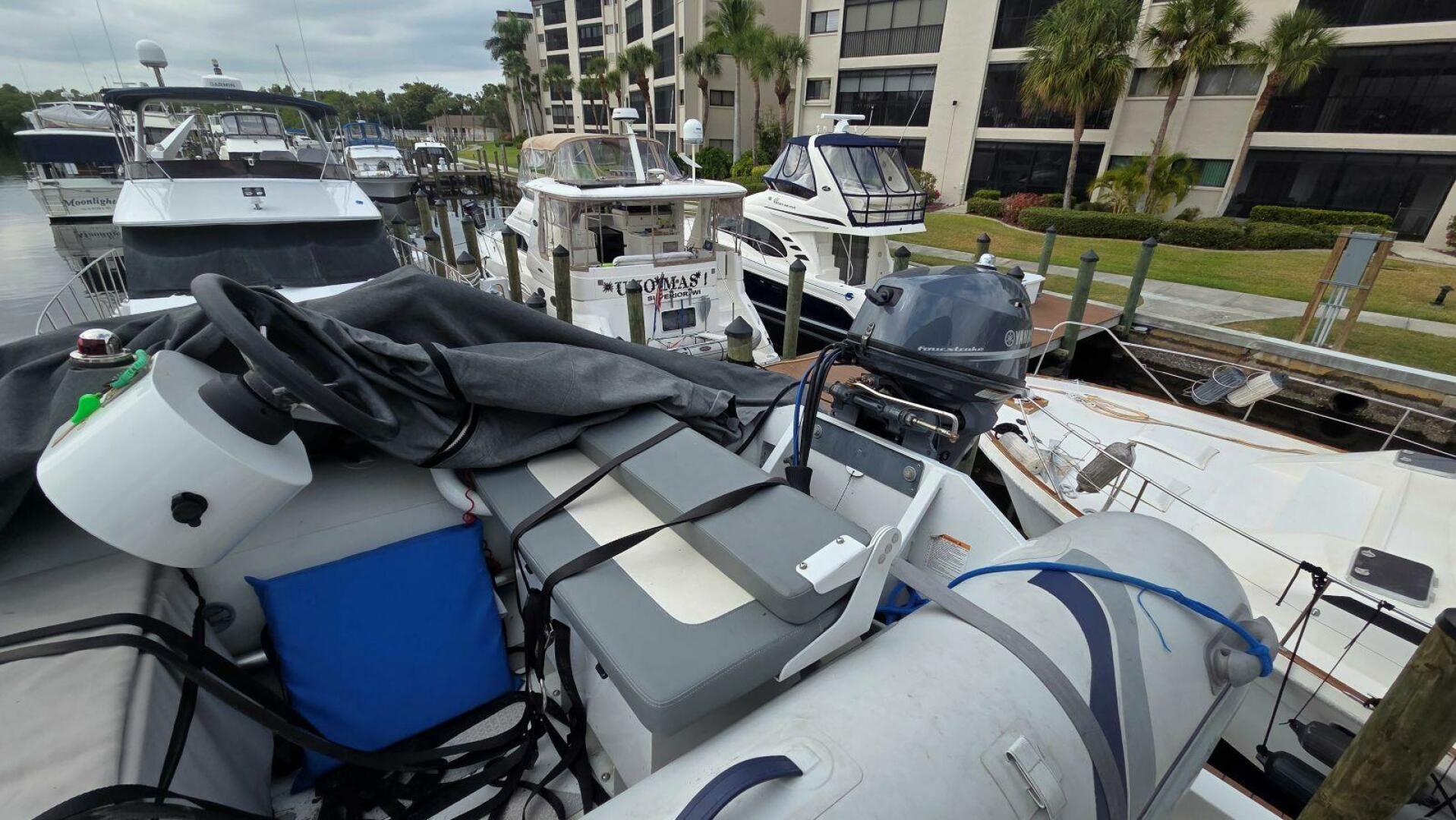 Aft on the flybridge is where the layout truly shines. Included with the sale is a 2019 Highfield tender powered by a 25 HP outboard with a console drive station, which stores cleanly and securely on the aft flybridge using the onboard davit crane. This arrangement keeps the cockpit and swim platform clear while allowing for easy deployment and retrieval.