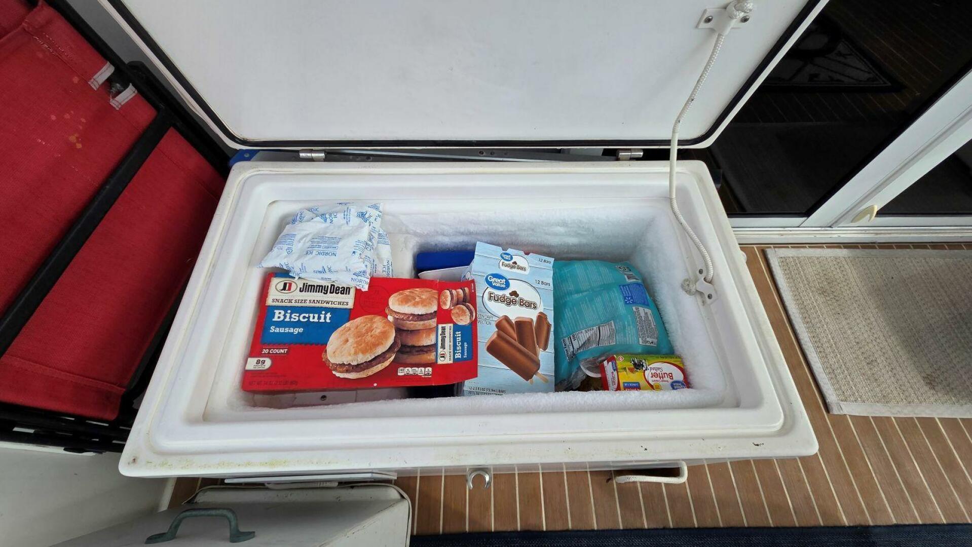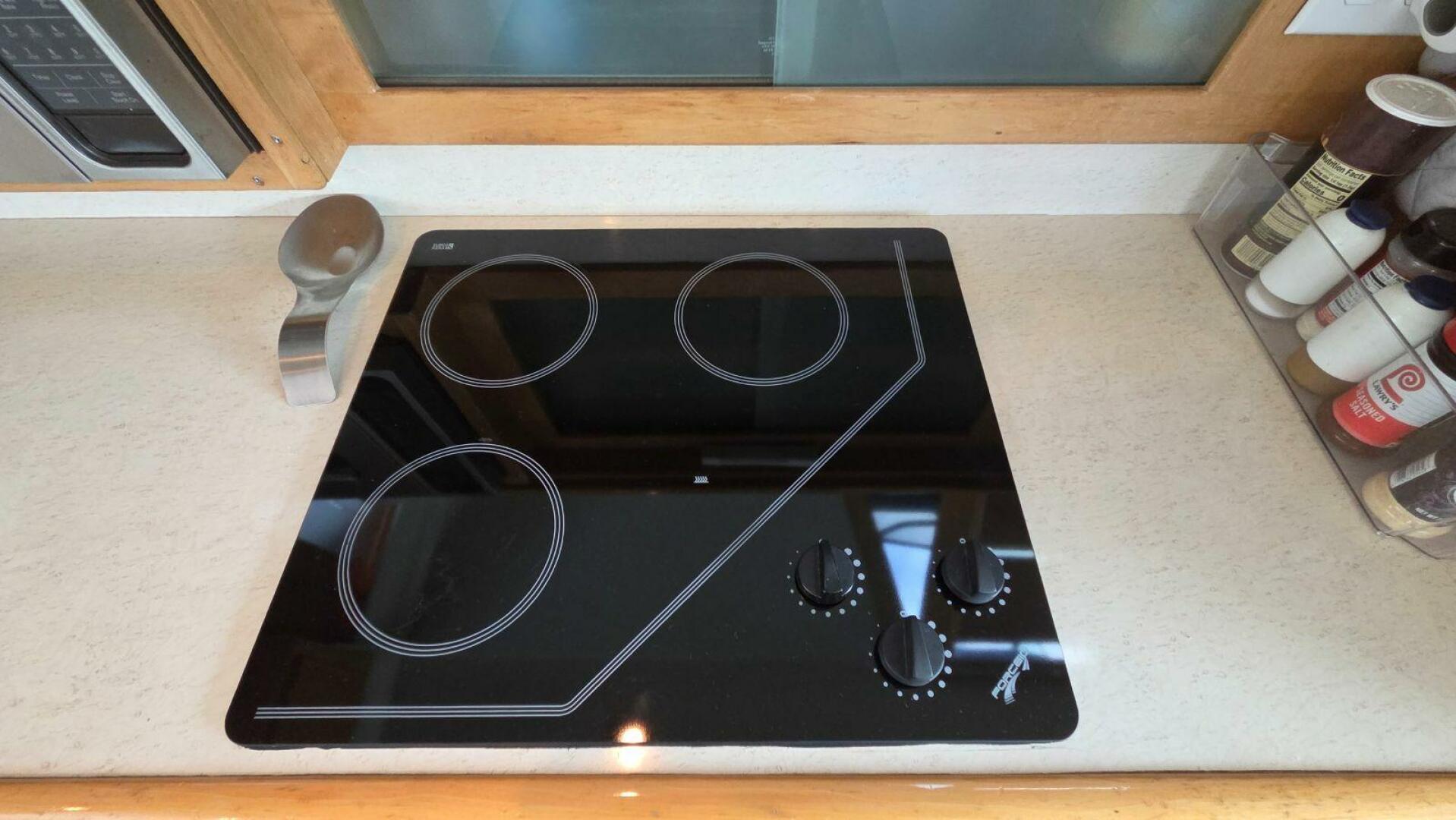 The galley has been thoughtfully upgraded to deliver true home-style cooking capability on the water. Equipment includes a near residential-size refrigerator and freezer (new in 2025), a three-burner ceramic cooktop, and a Viking convection oven, along with a double-basin sink that enhances functionality for food preparation and cleanup. To starboard, a neatly integrated built-in icemaker adds convenience for entertaining or extended stays aboard.