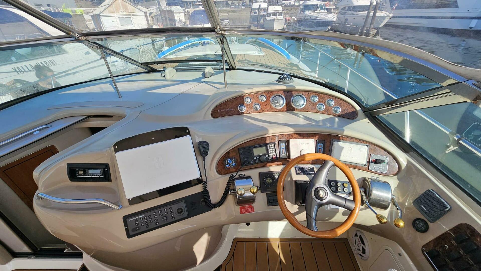 - Captain's Command: A custom sliding/swiveling helm seat with flip-up thigh rise and an ergonomic console puts all controls and advanced electronics at your fingertips.