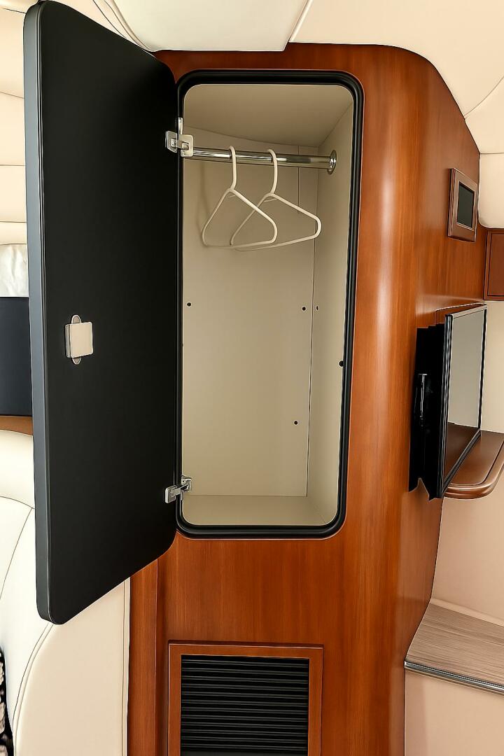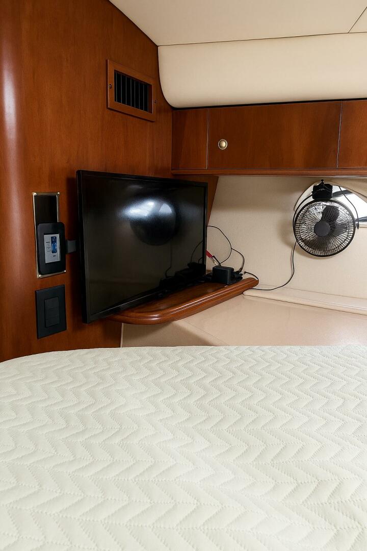 - Forward stateroom with island queen berth, privacy door, and ample storage