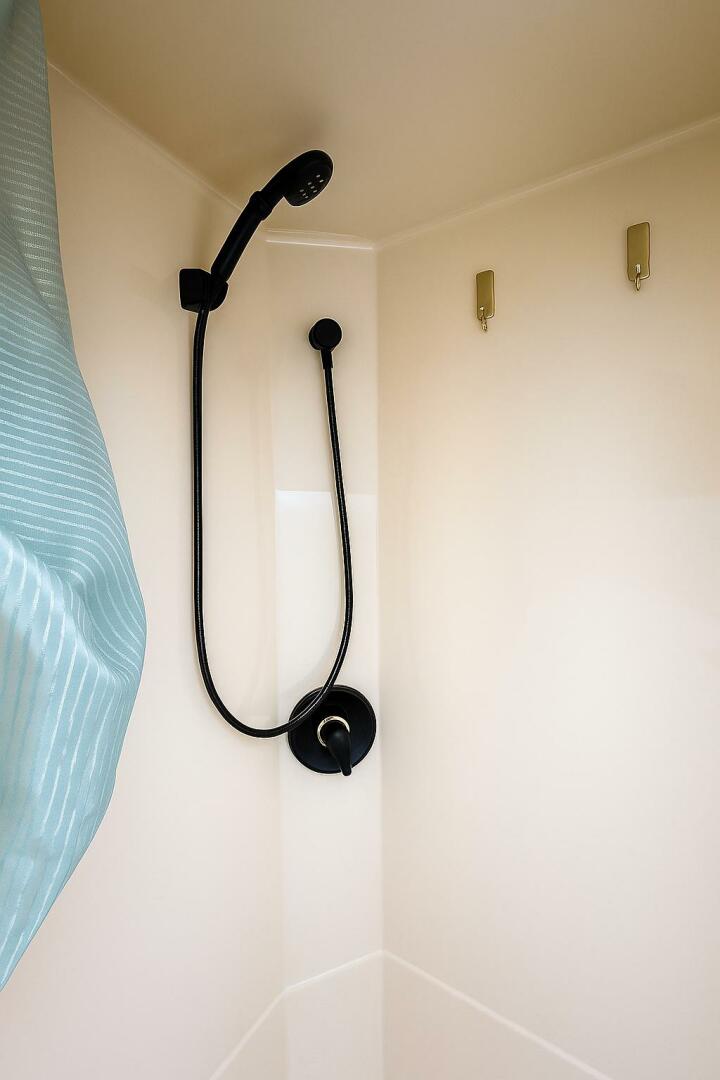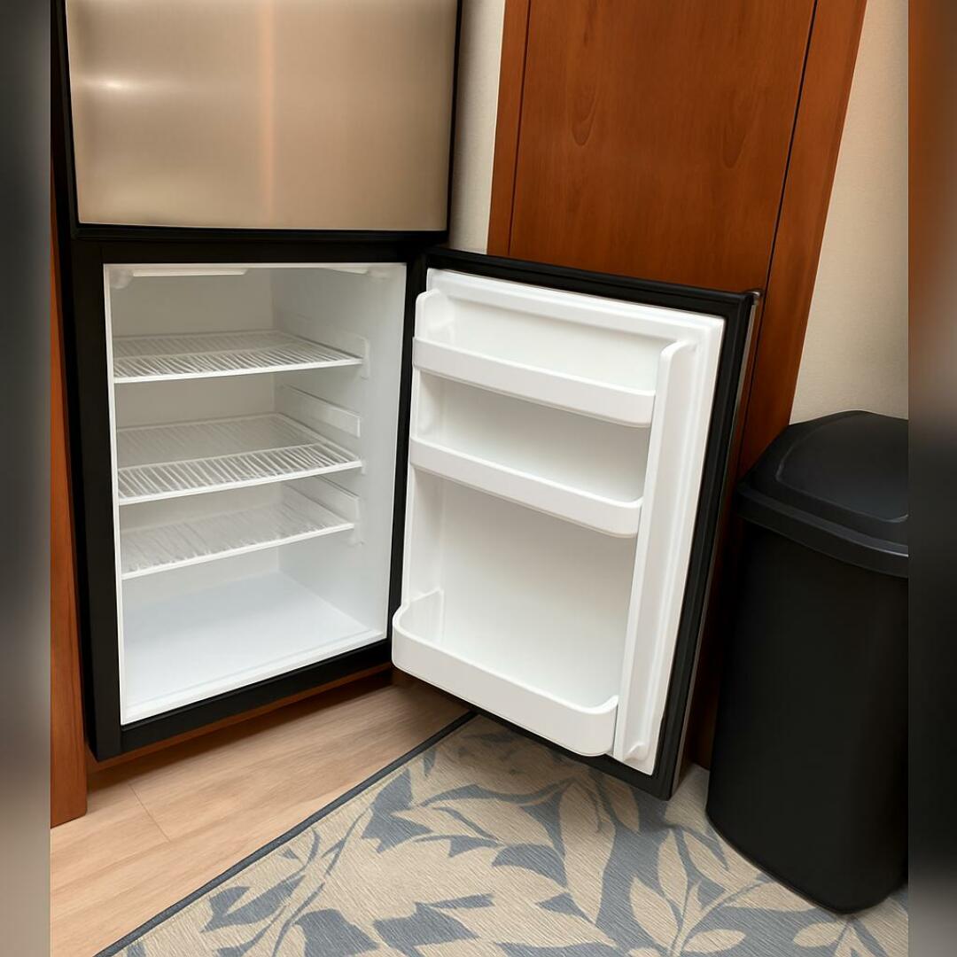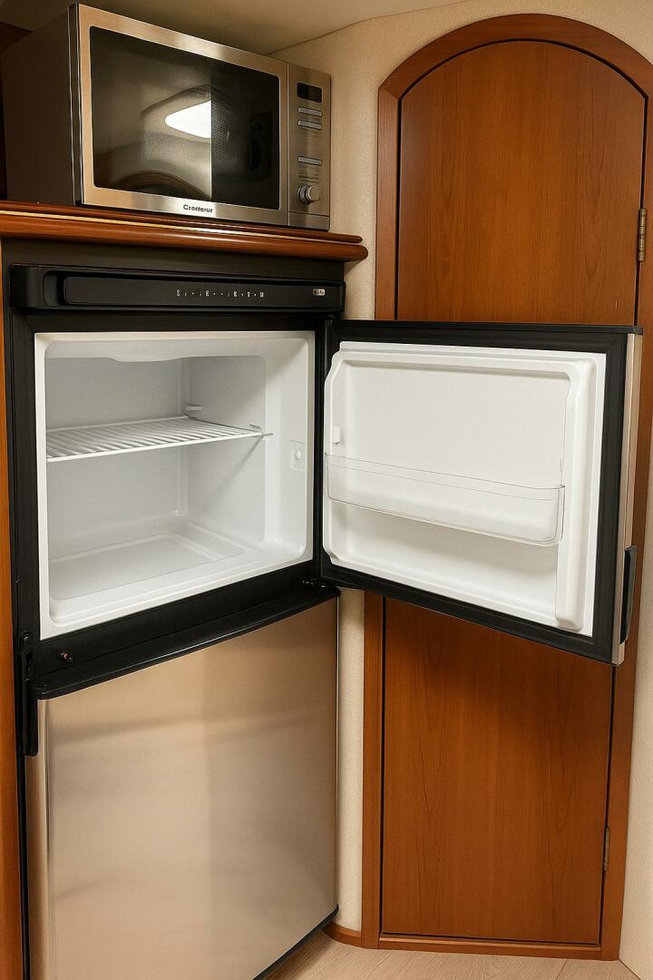 - Fully equipped galley with large fridge/freezer, microwave, and electric two-burner stove