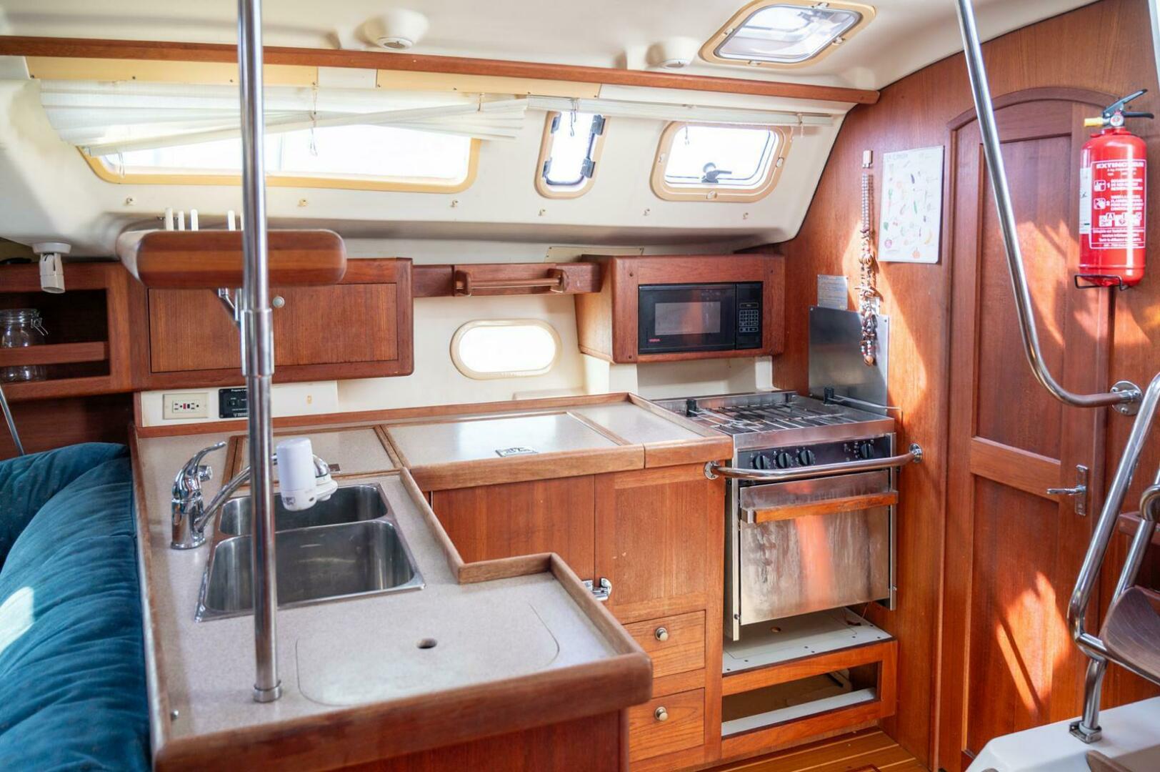 • L-shaped galley to starboard with Force 10 stove and oven, 110V microwave, dual-access fridge/freezer, dual stainless sinks, hot and cold pressure water, manual backup pump, Corian counters, and generous storage