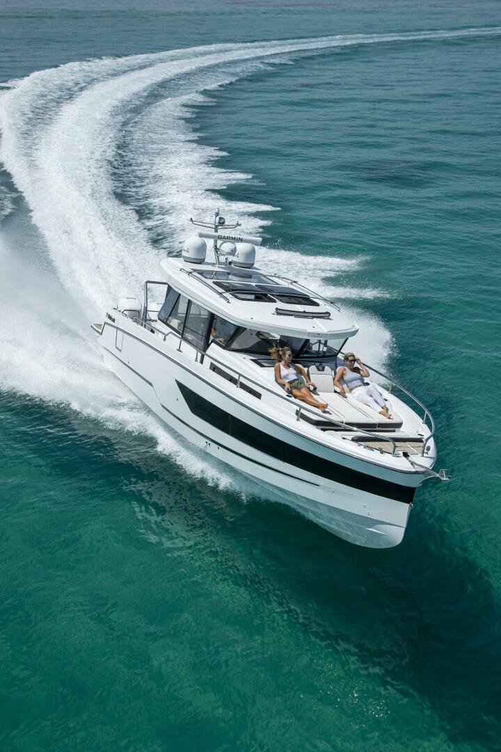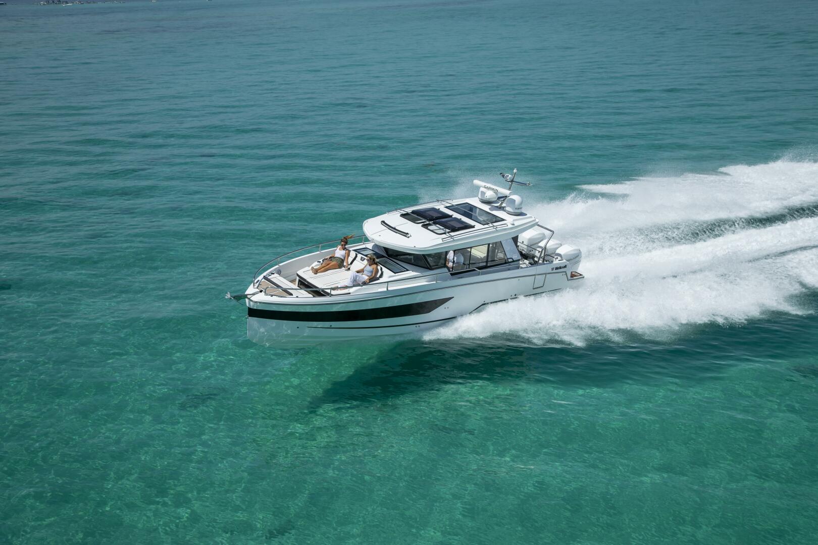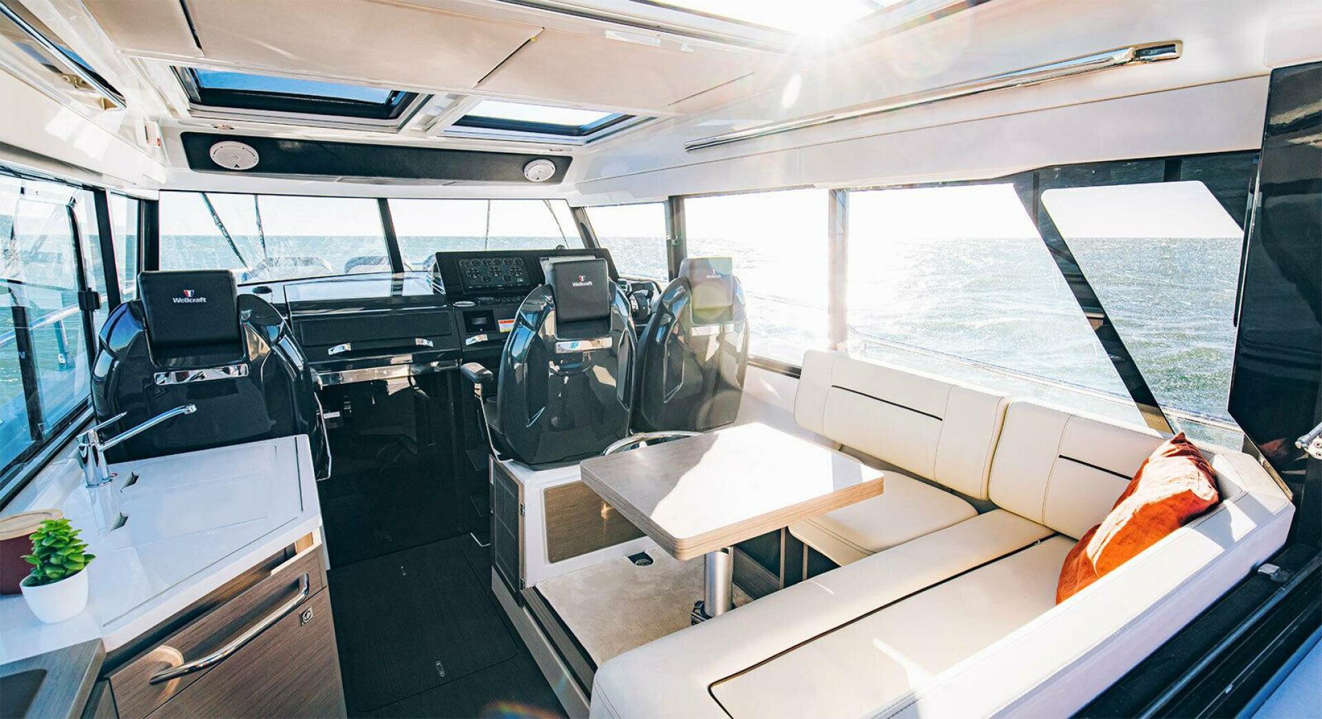 The Wellcraft 38 Explorer allows boaters to combine the thrill of piloting at high speed and the ability to discover unexplored places with a lifestyle of relaxation and luxury. The spacious wheelhouse with fully equipped galley provides comfort for five while cruising along. A sliding side door at the helm grants convenient access to the side passage and front cockpit. Three large sunbathers, with a spacious bench in the bow, create a luxurious place for relaxing. On the either side of the aft cockpit, two large side gates enable easy boarding access. One of the most extraordinary features of the Wellcraft 38 Explorer is the connection between the wheelhouse and the aft cockpit: simply open the top-hinged window and entrance door and feel the outside getting inside. Find the real luxury feeling of the Wellcraft 38 Explorer stepping down in the spacious front cabin with a full-size bed and ensuite bathroom with separate shower. Overall, you may sleep up to four people onboard!