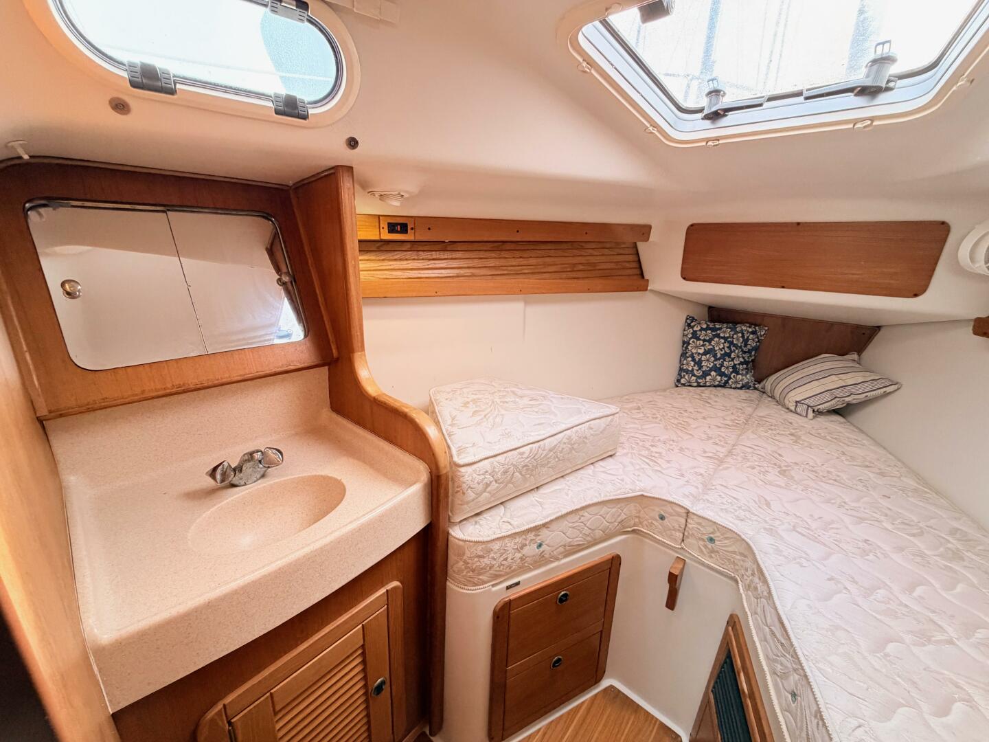 A key advantage on Margaret Ann is her shoal-draft wing keel (4'10”), making her perfectly at home on the Chesapeake—and equally attractive for the Bahamas/Caribbean where draft opens doors. Belowdecks, the Catalina 380 is famous for the aft owner’s cabin with a true walk-around “island” berth—the kind of layout that makes weekends turn into weeks. Many Catalina 380 listings talk about this as the signature feature, because it’s genuinely hard to find this much “owner cabin” comfort in a conventional aft-cockpit cruiser of this era.