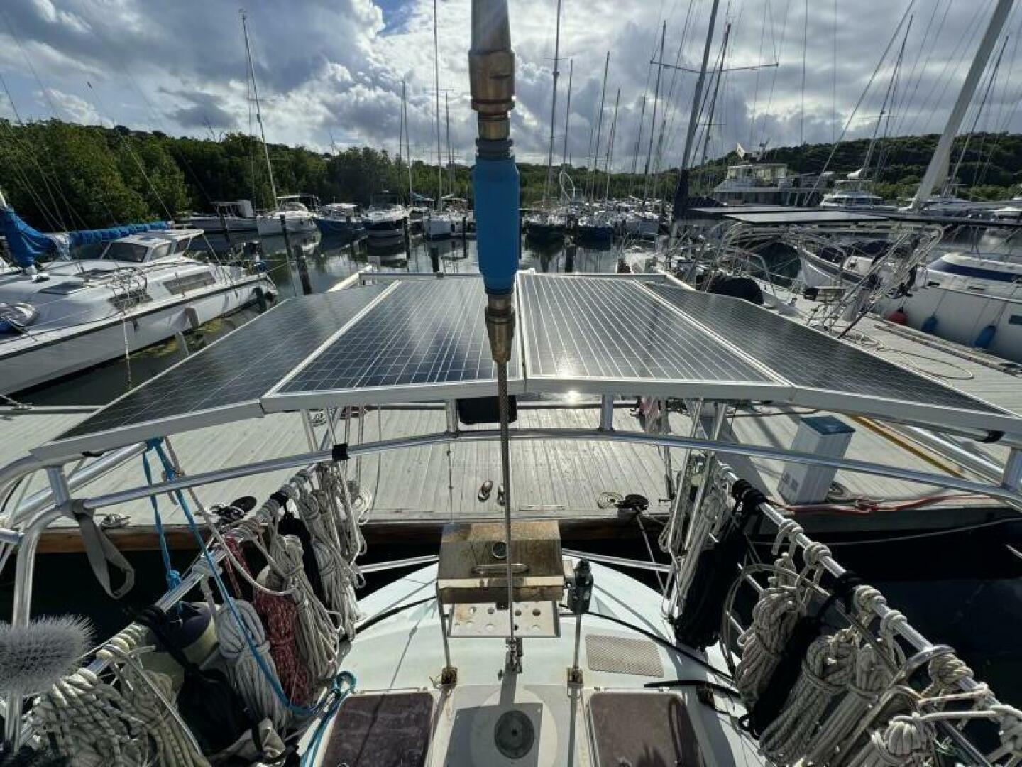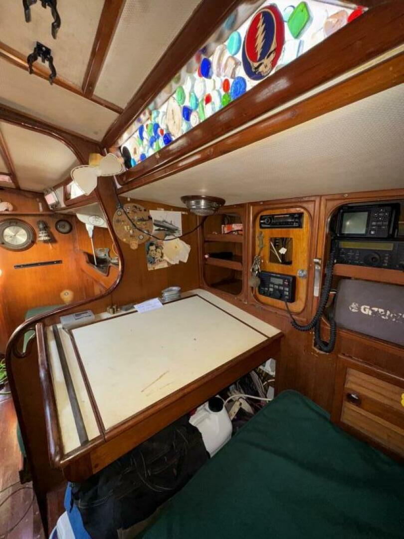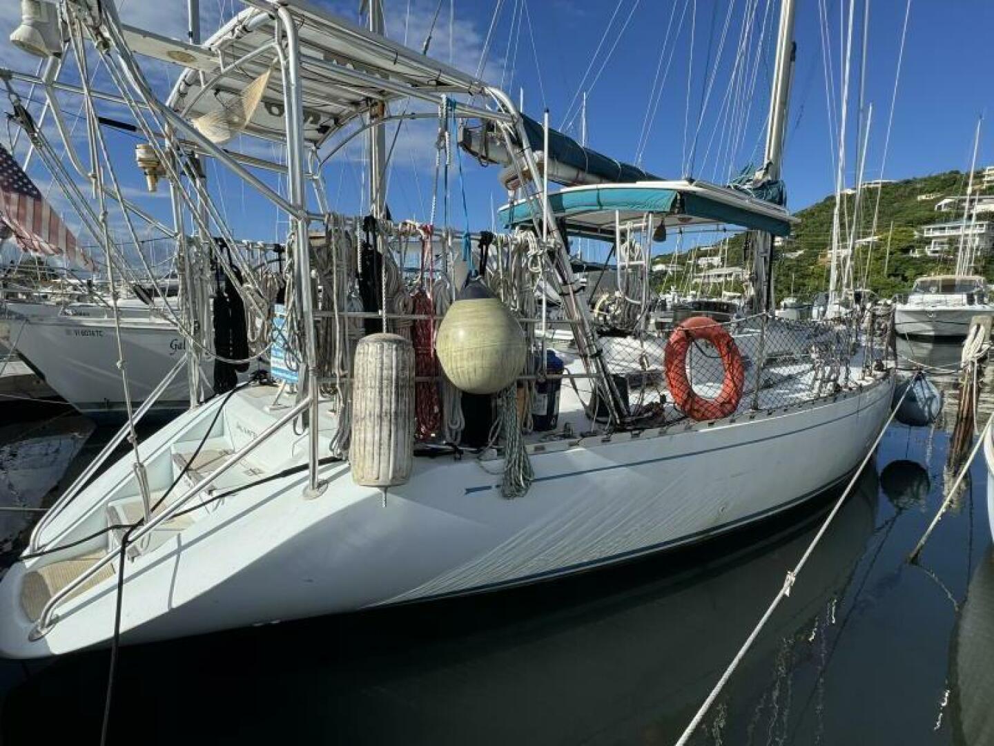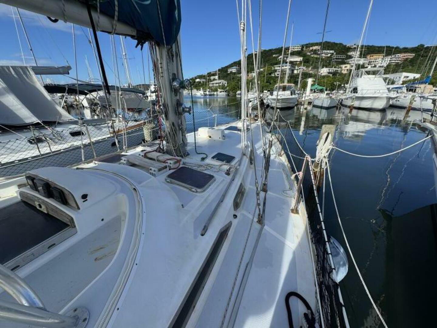 The solid fiberglass hull, reinforced internal structure, and deep lead ballast deliver exceptional durability and a stable, sea-kindly motion. A cutter rig provides versatile sail-handling across varied conditions, complemented by through-bolted deck hardware and a well-engineered deck layout for reliable offshore performance.