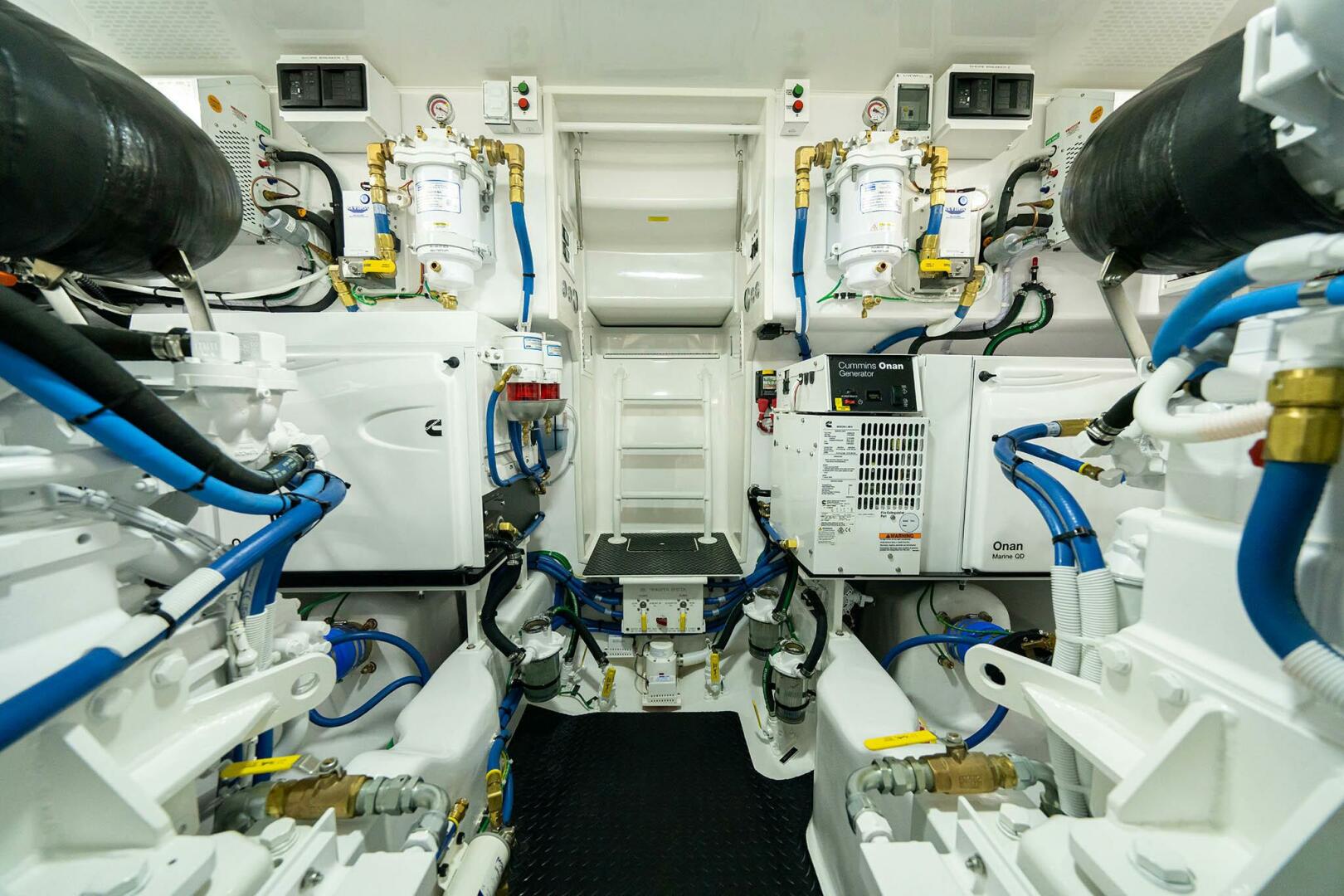 With its Optimus Electronic Power Steering matched to stainless-steel, high-speed rudders and single-lever electronic controls, the 54 delivers outstanding performance, comfort and range. As you would expect, the engine room is equipped in the Viking tradition with outstanding engineering that is exclusive to this design and maximizes access and serviceability. Mechanical and electrical equipment includes a Delta-T ventilation system with supply and discharge fans for proper fresh air supply and water suppression; an oil changing system for the engines, transmission and generator; and a fire suppression system. The 54 also comes standard with an Onan 21.5 kW E-QD (electronic quiet diesel) Series generator.