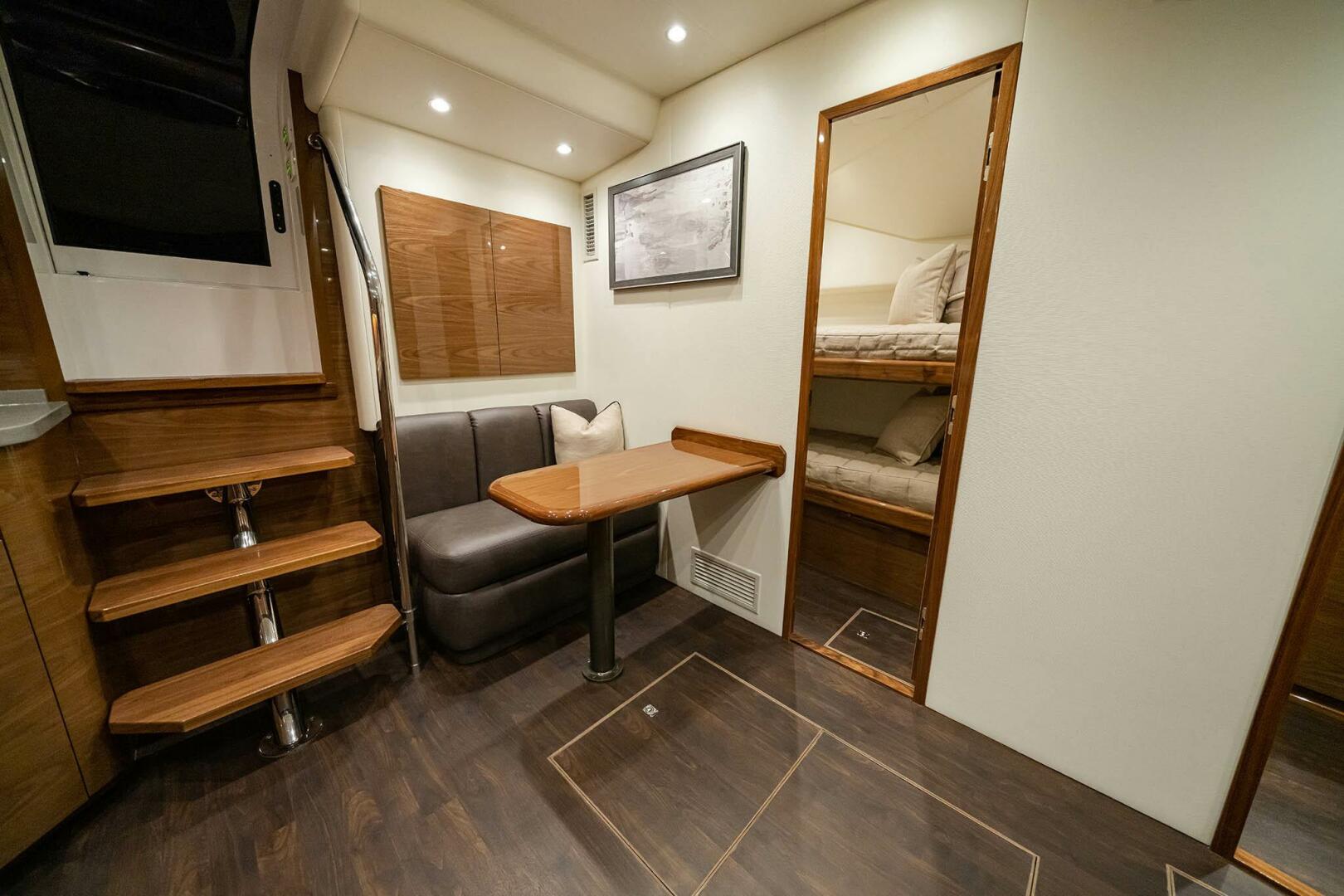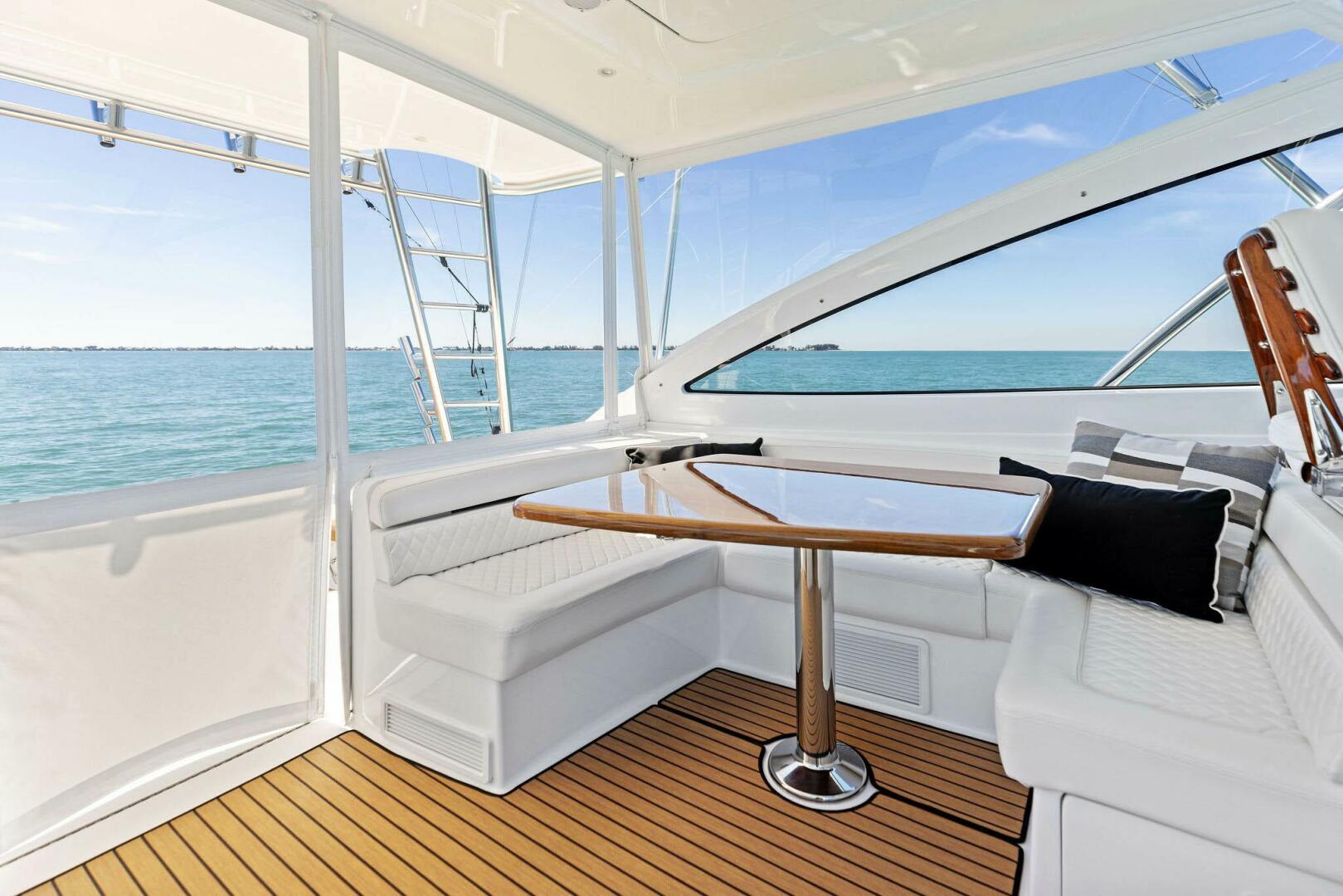 Aft of the helm, there is a convergence of practical and convenience features, including refrigeration and tackle and gear storage compartments. Plump cushions topping the port-side U-shape lounge, which surrounds a walnut table, will cradle your guests in comfort while providing ample height to take in the surroundings. To port, you’ll also find an L-shaped lounge with storage underneath.