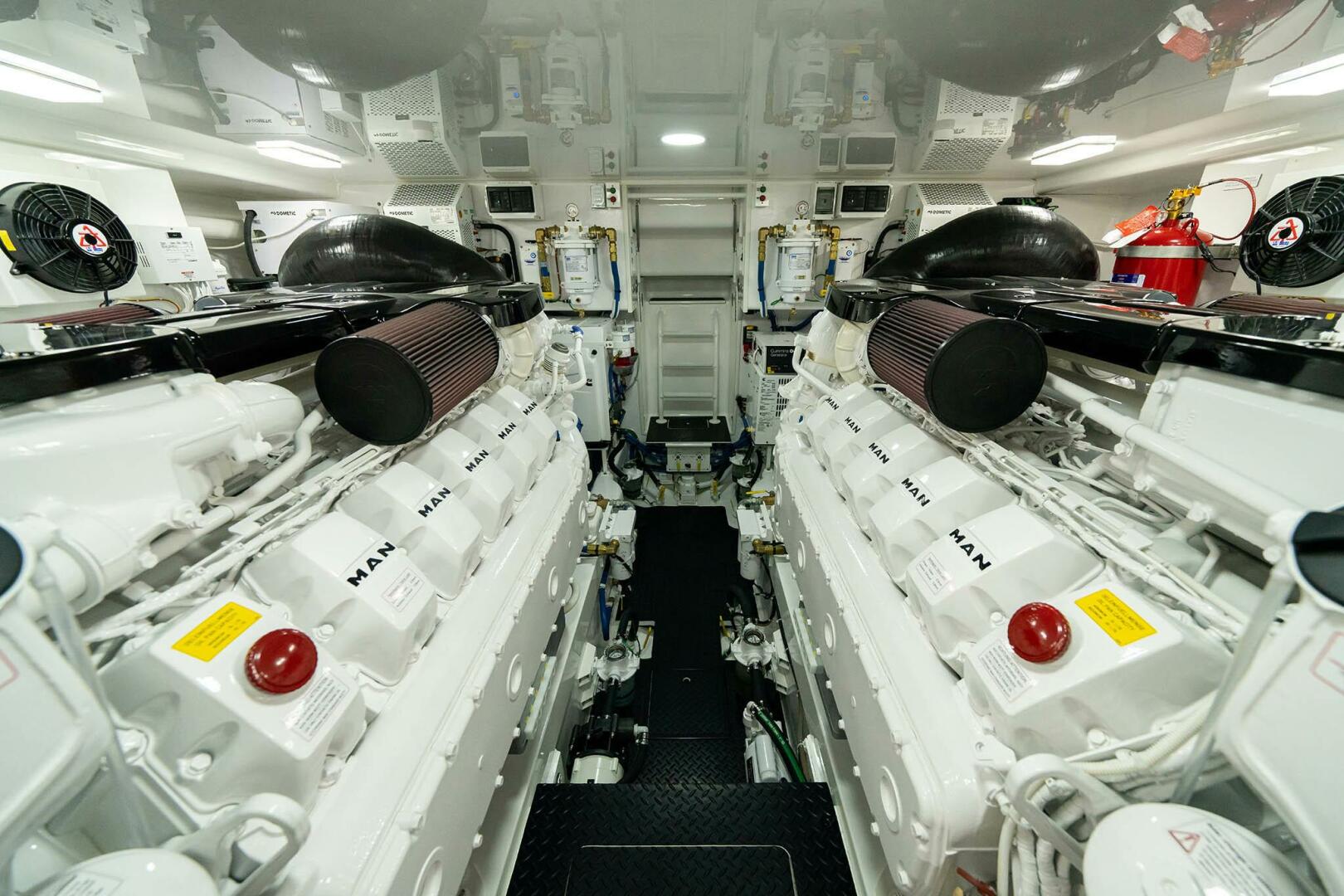 The engine room, easily reached through lift-up steps built into the mezzanine, houses the twin powerplants. A pair of MAN V12 1400CRM (1400 MHP) engines serve as the standard propulsion package. Hull No. 1 – a Sport Tower model – will be powered with the optional MAN V12 1550CRM (1550 MHP) engines.