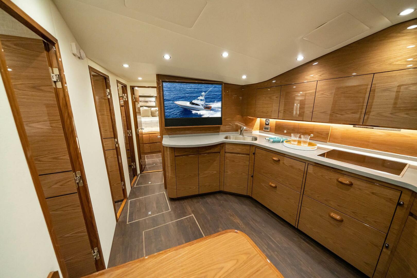 Below, the 17 ft. 8 in. beam offers volumes of interior space including a choice of two- or three-stateroom layouts. With either, the forward master stateroom is large and fitted with a queen-size bed, plenty of storage behind the horizontal grain walnut cabinetry and served with a private head. Additional staterooms are found on the port side, each with upper and lower berths. The head has private access in the two-stateroom layout, while guests share the head in the three-stateroom plan. Midship on the starboard side is a well-appointed galley with a full appliance package, walnut cabinetry, an engineered stone countertop and under-counter refrigeration/freezer units (with varnished horizontal grain walnut faces). Opposite the galley in the two-stateroom model is an L-shaped lounge and table. The three-stateroom version utilizes booth seating. Other notable amenities include a 43” HD TV, Amtico flooring in the salon/galley/dinette and premium carpeting in the staterooms.