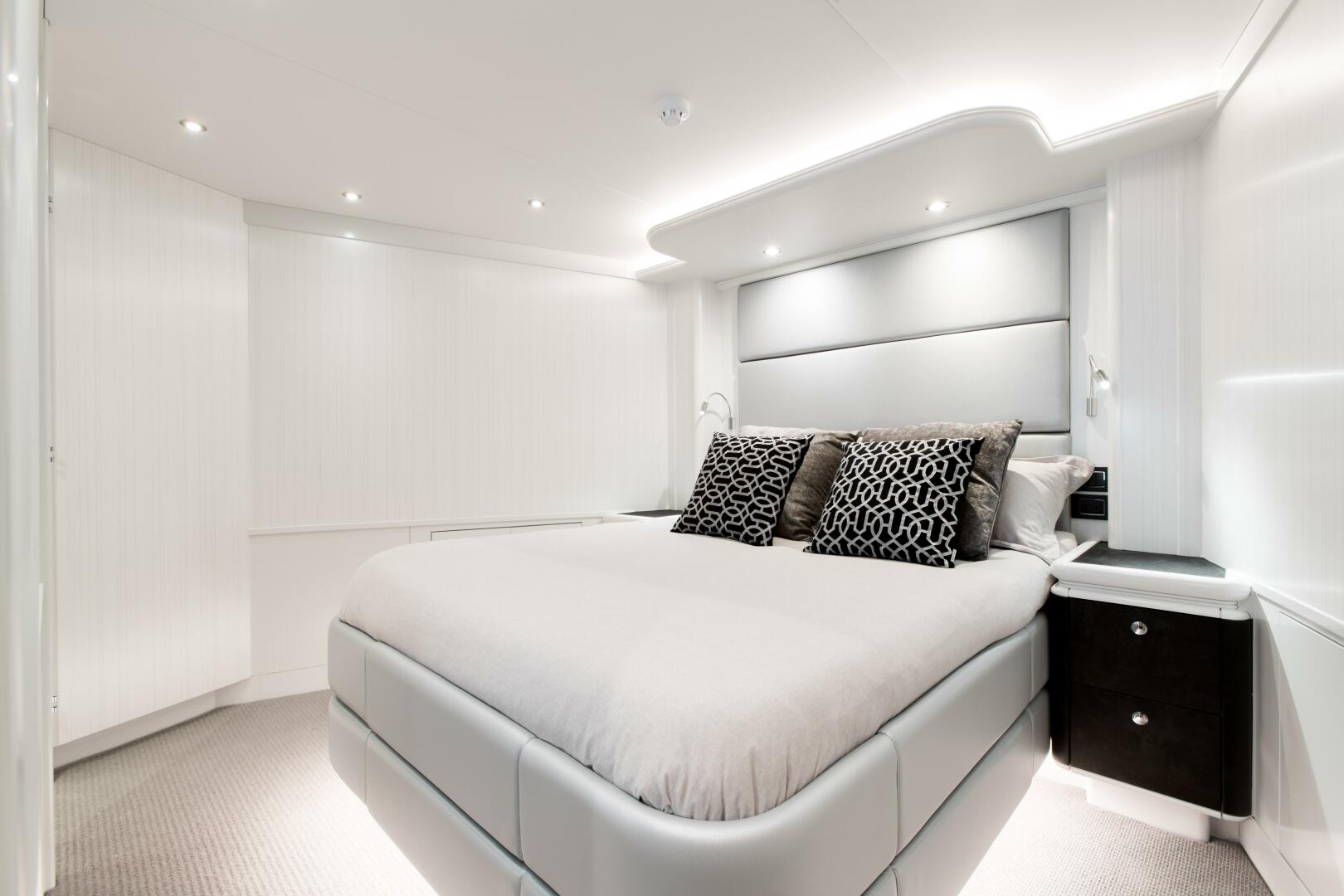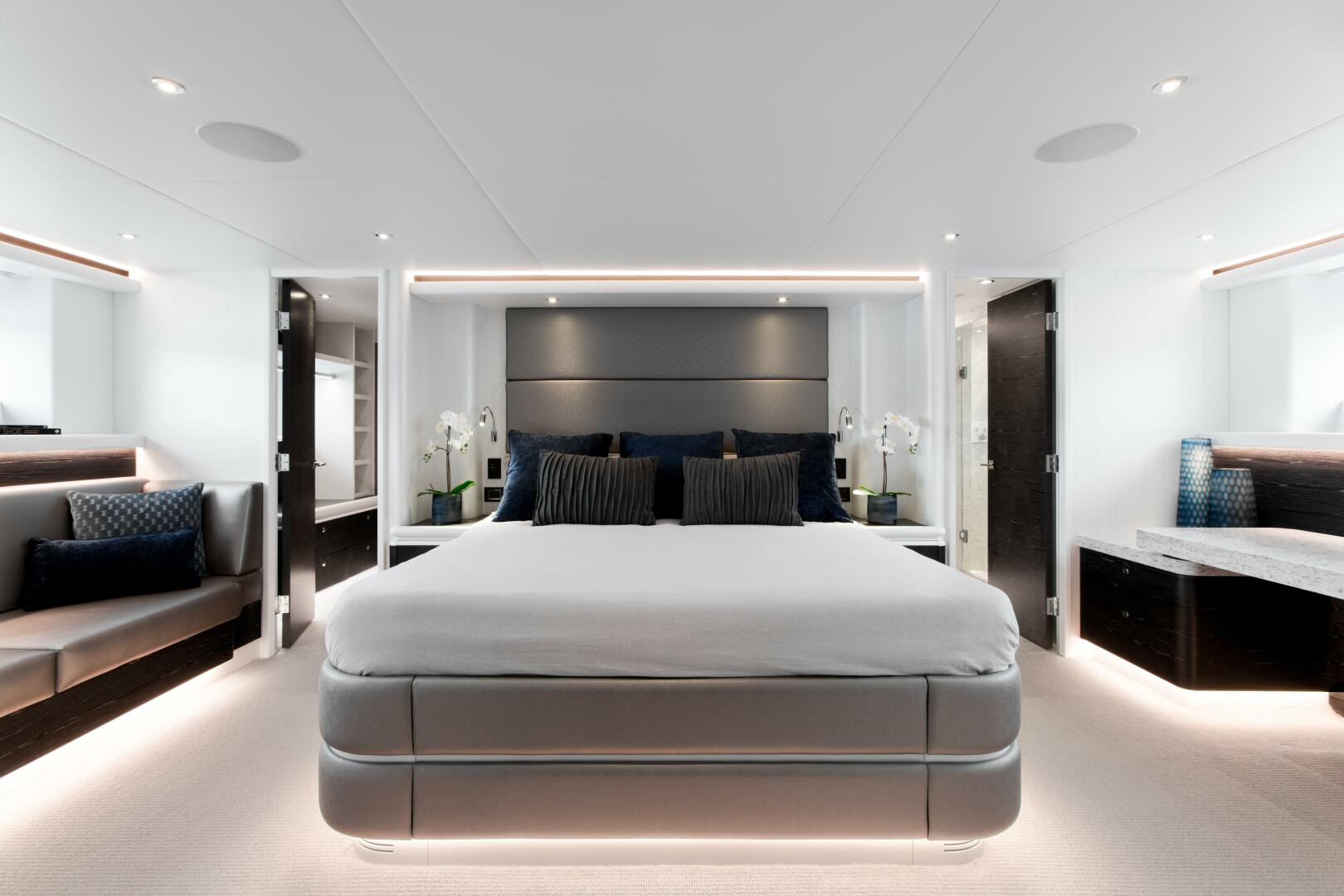 Full-beam main-deck owner’s stateroom with big windows, walk-in closet, and a high-end ensuite. Lower deck: VIP, double, and twin staterooms — all ensuites. Separate crew area for up to 5 with mess + laundry. Overall design is modern, bright, and very guest friendly.
