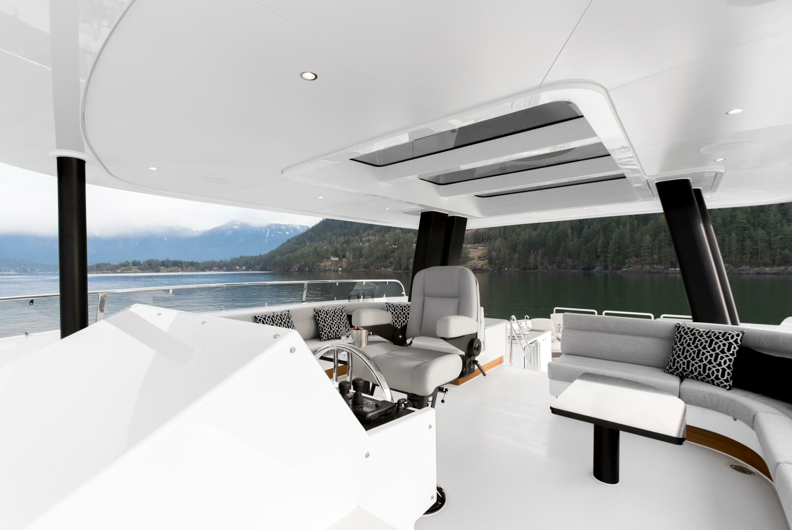 Large aft deck with dining/seating. Full-beam salon with big windows and clean, modern styling. Dining area + bar forward in the salon. “Country-kitchen” galley with breakfast nook — very livable. Forward: the master suite with big views. Raised pilothouse above with excellent visibility and guest seating. Walk-around decks with access to the sundeck.