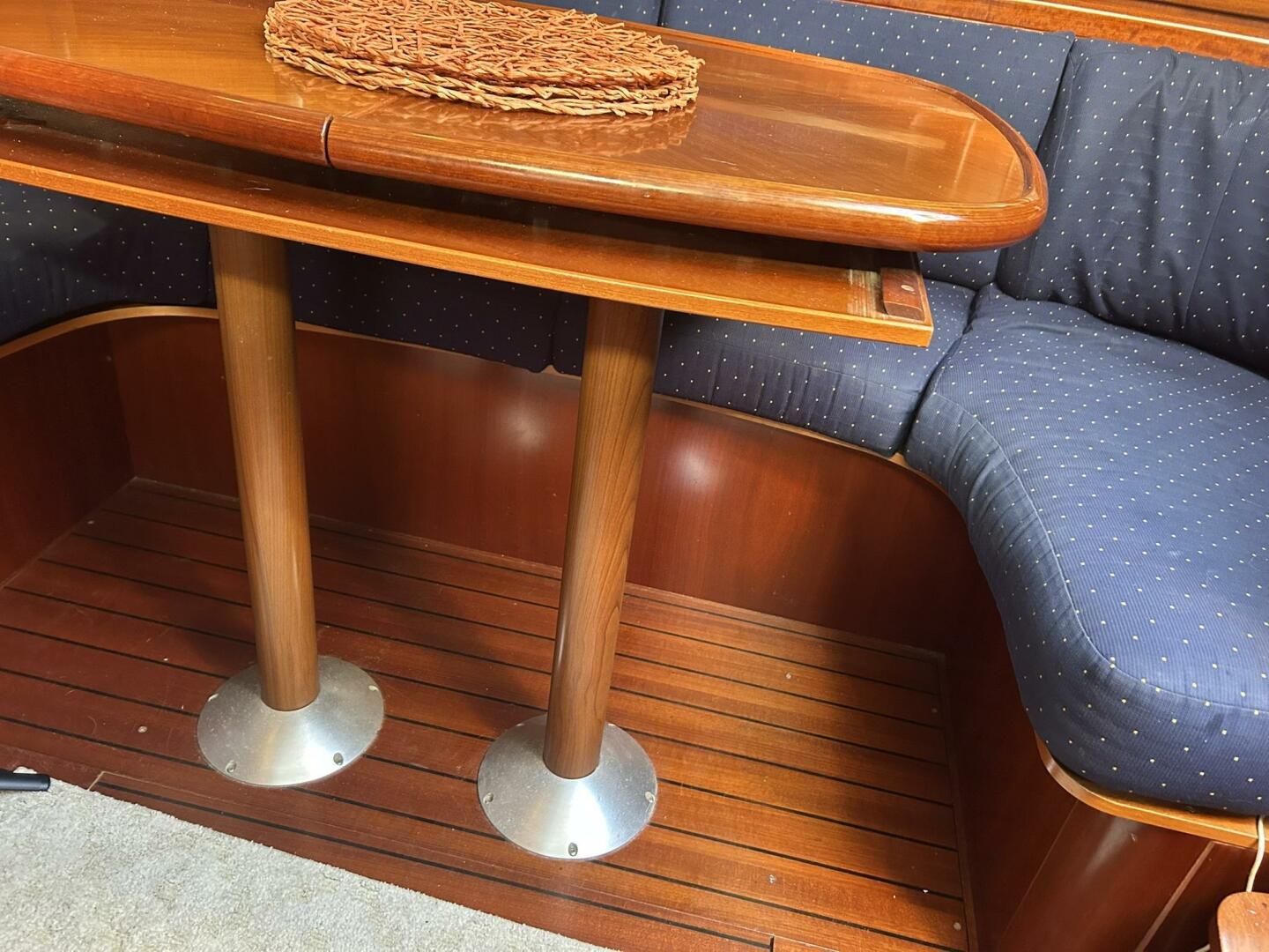 Starting topsides, Sea No Evil greets you with a center cockpit layout that immediately conveys security and ease. The protected helm, well-placed handholds, and thoughtful cockpit ergonomics make handling straightforward whether you’re single-handling or sailing with crew. The cockpit is spacious, with easy access to lines and winches, and the opening windscreen gives visibility and air when you want it, or shelter when conditions dictate, a design detail you’ll appreciate on longer passages or at anchor. Sea No Evil’s hull lines are classic Beneteau: efficient, balanced and easy-sailing, making her predictable and enjoyable in a variety of sea states. The innovative aft transom with a drop-down bathing platform extends the usable deck space when at anchor, and the integrated gangway simplifies dock arrivals and departures, especially when snug stern-to. This really is a cool and smart feature.