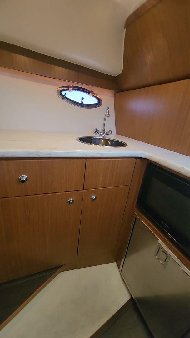 One level main deck access to the enclosed helm area offers seating and table portside with a Kenyon electric grill sink combination bar with refrigerator to starboard. The hardtop has a manual sliding sunroof with superior sliding track and lock for letting the sunshine in or keeping the weather out.