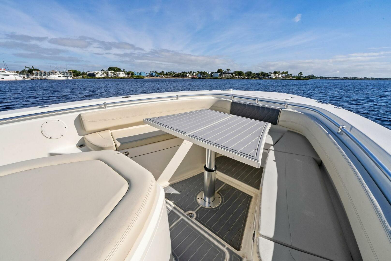 When it’s time to relax, the 350 CC “converts” into a cruising and sandbar-hopping vessel. It has comfortable seating for up to 11 people: this includes triple independent helm seats, an integrated chaise lounge big enough for two, and a forward sun-lounge area with backrests. There’s also a hideaway bow table that electronically rises from the floor—nice for picnics or entertaining.