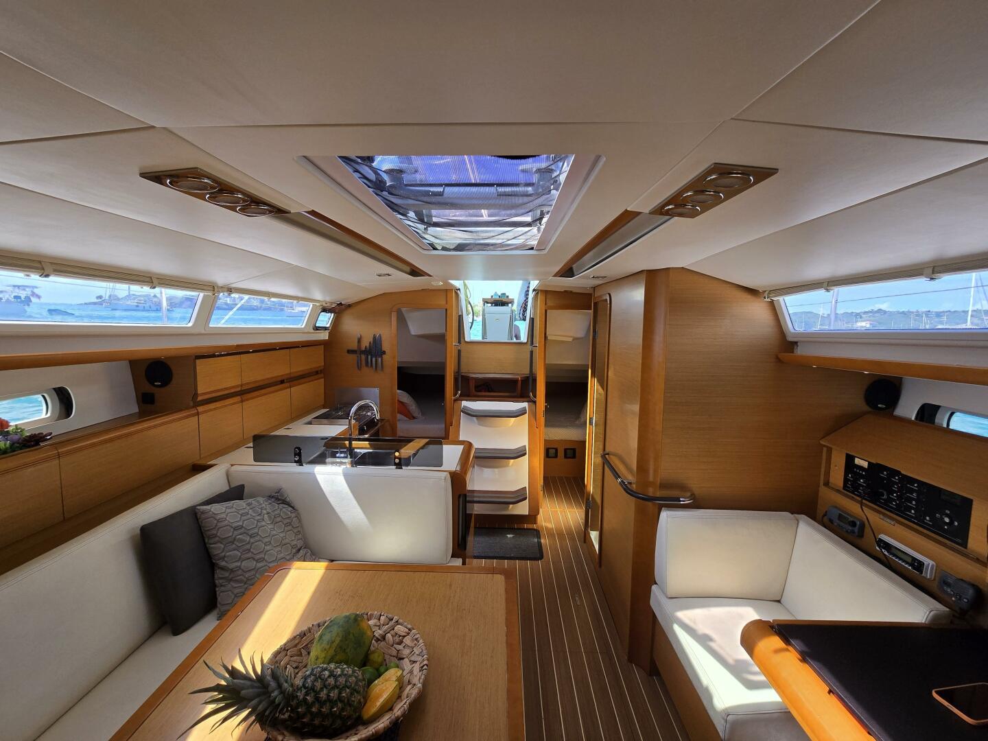Below deck, she offers the bright, airy interior Jeanneau is known for, making her an ideal liveaboard cruiser. Her spacious layout provides excellent ventilation, ample storage for long-term cruising, and comfortable living both underway and at anchor.