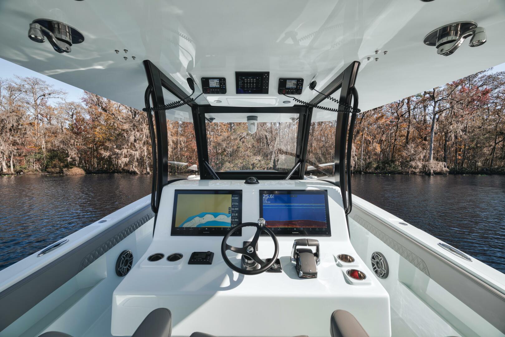 At 37’9″, and a 12′ beam, she is bigger than most other boats in her class. Sporting a large deck area, flared bow, and high-performance step bottom, she will run further and faster than others in her class. She is as accommodating as many boats that are much larger.