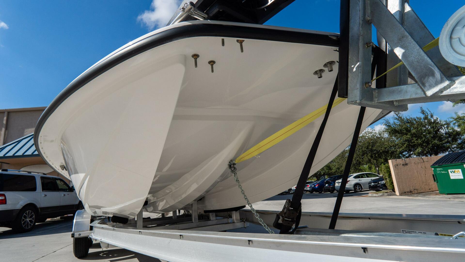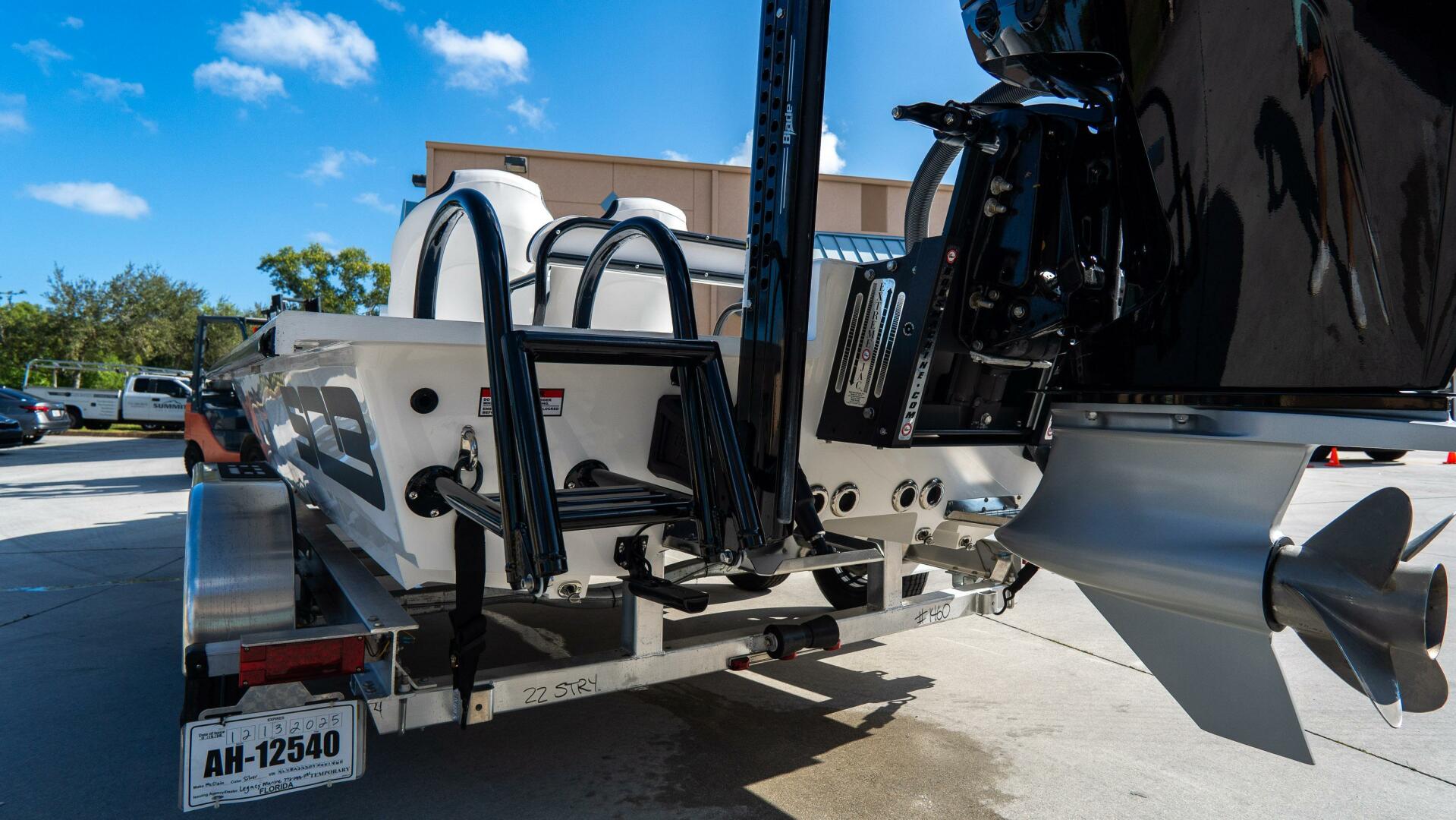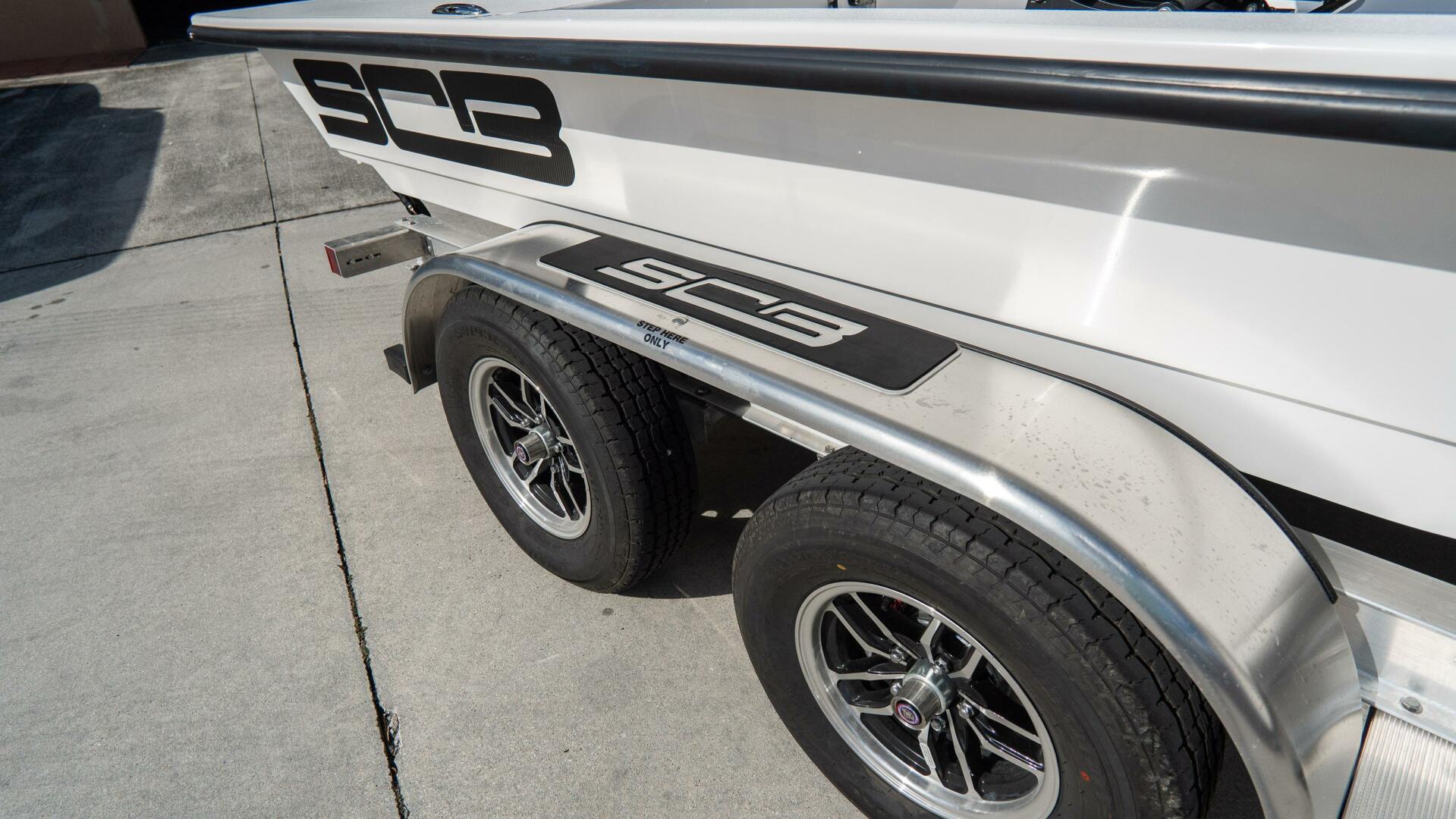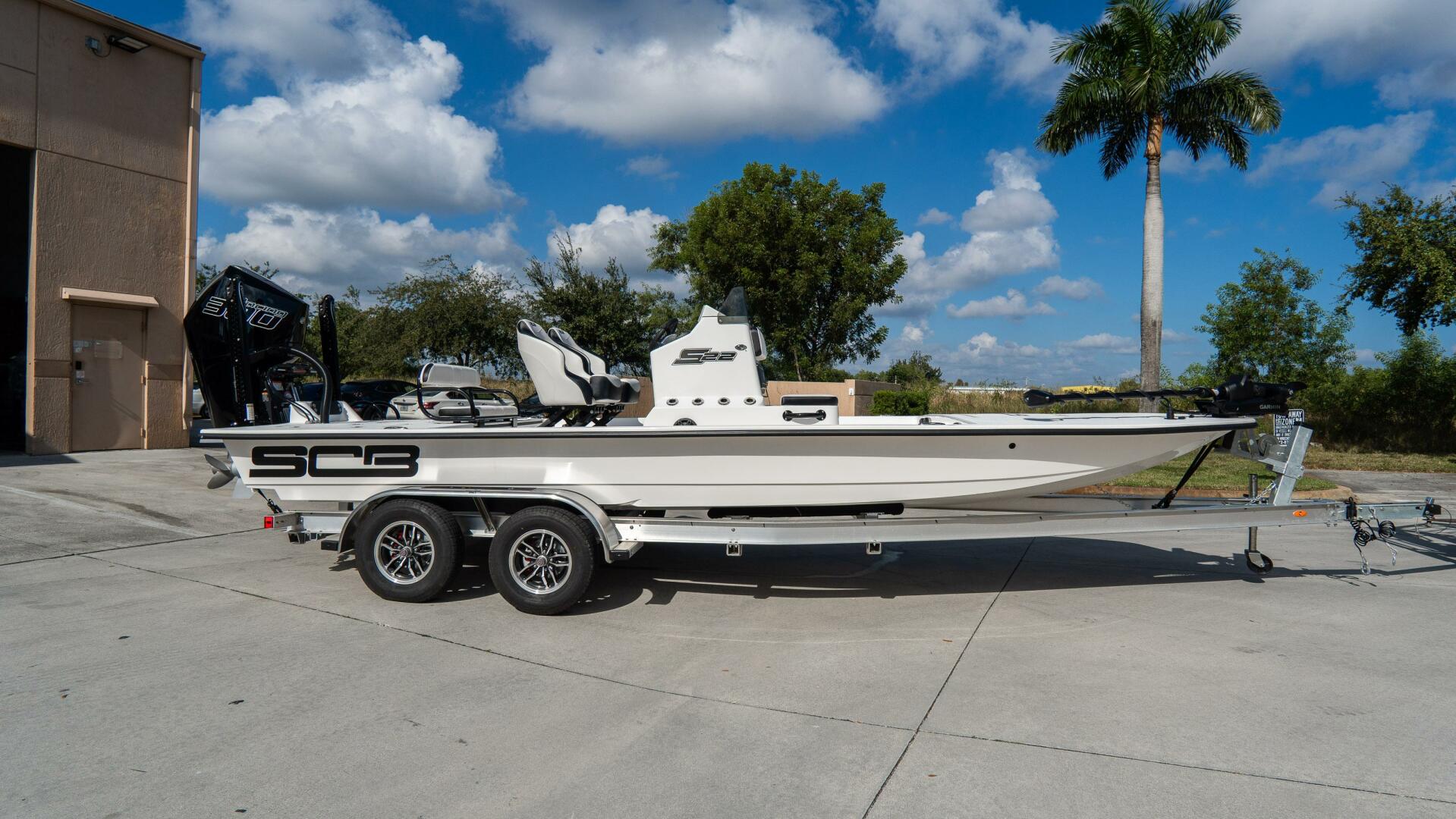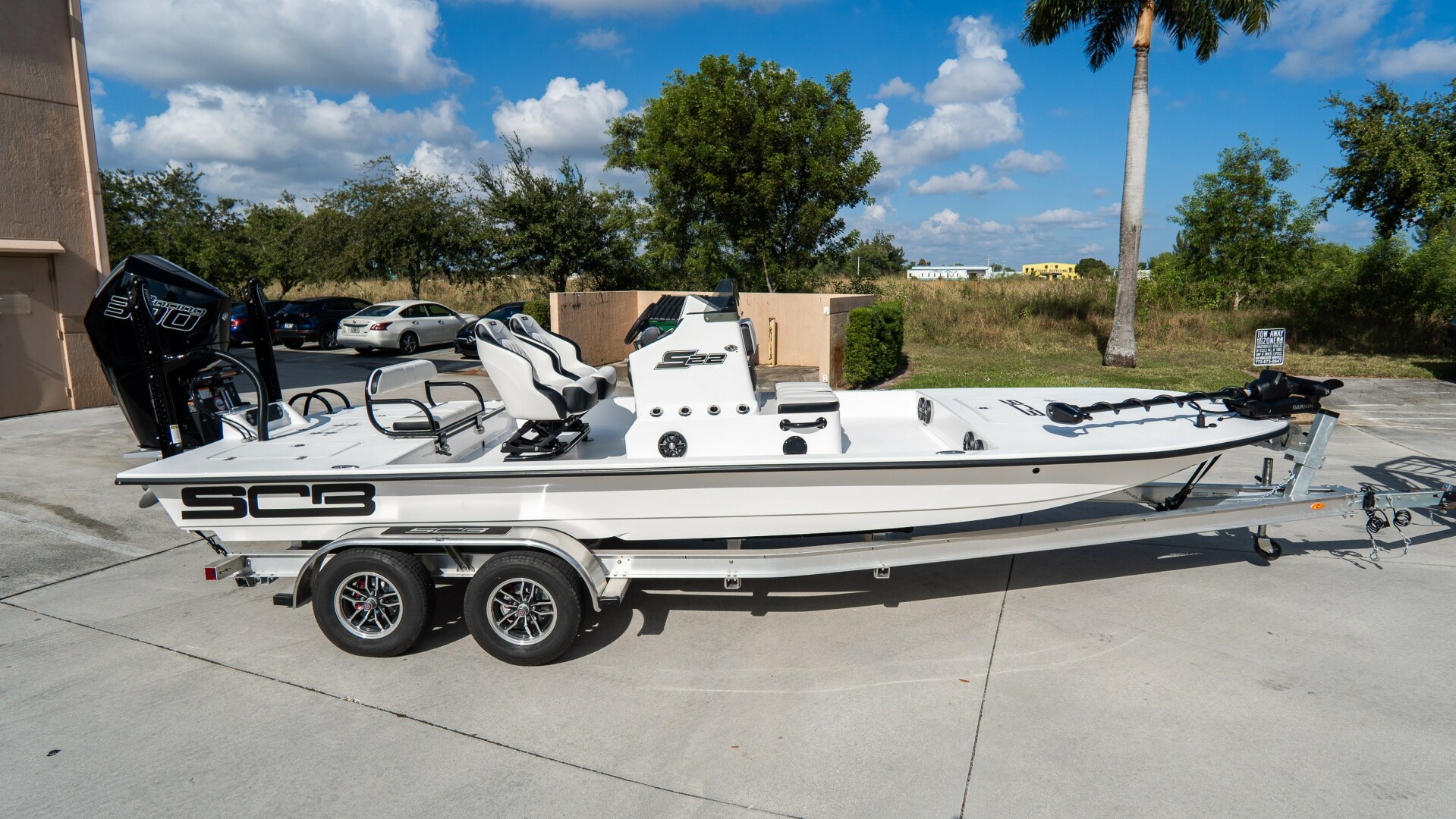 2026 SCB S22 with only 5 hours. Mercury 300R Sport Master, power steering, trim tabs, Shockwave seating, square console w/ FWD livewell, removable rear bench, extra battery, stainless rod holders. Includes McClain double-axle trailer with torsion axles and disc brakes.