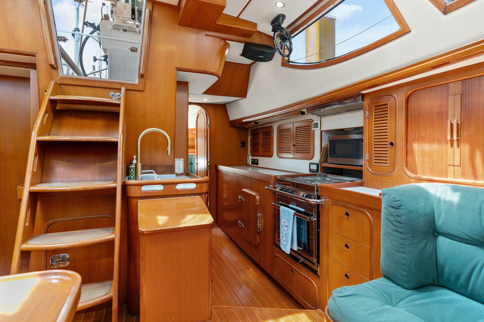 The interior of Callahan boasts a bright and comfortable main salon, distinguished by varnished teak joinery, large fixed windows, and various opening portlights and hatches. Standout features include beautiful joinery, louvered cabinetry, fiddled teak trimming, integrated grab rails, and a teak and holly cabin sole.