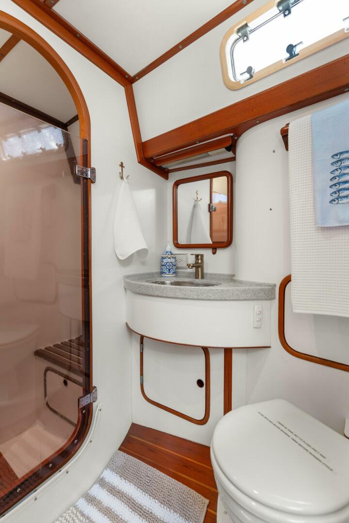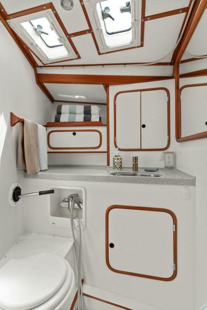 Descending the companionway, the raised main salon offers two large settees, a dining table, and a navigation station to starboard. To port, the passageway galley leads aft to the spacious owner's stateroom, which features a center-line queen berth and an en-suite head with a separate shower stall. Moving forward, a port passageway provides a custom desk with a removable stool, which can also be utilized in the main salon for extra seating. The forward V-berth cabin has adjacent access to the day head/wet head. Callahan can comfortably sleep six people across its two cabins and the convertible settee in the main salon and provides plentiful storage throughout.