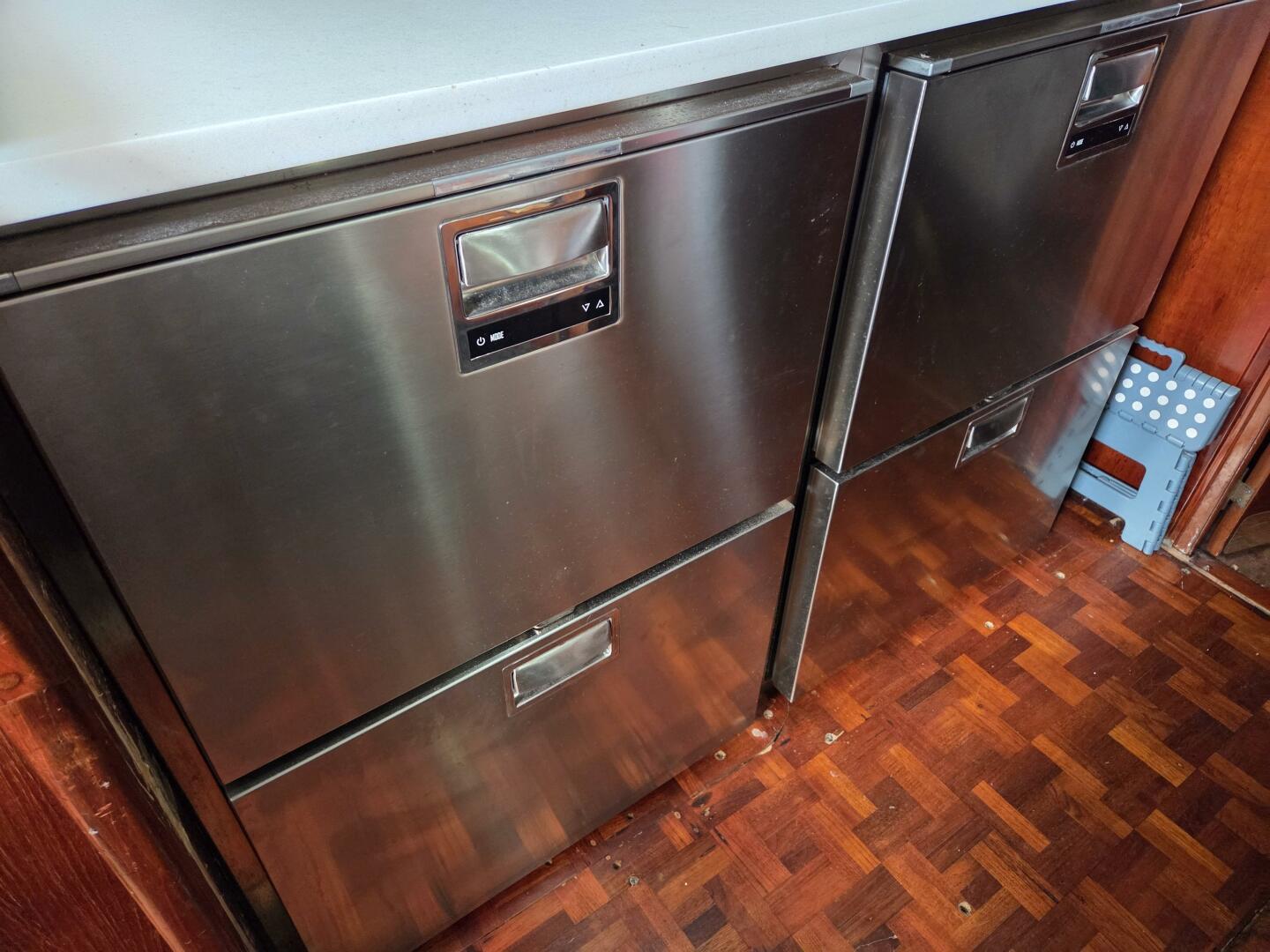 - Starboard Cabin: The former head has been converted into a work room, housing the genset, watermaker, and supplies parts.