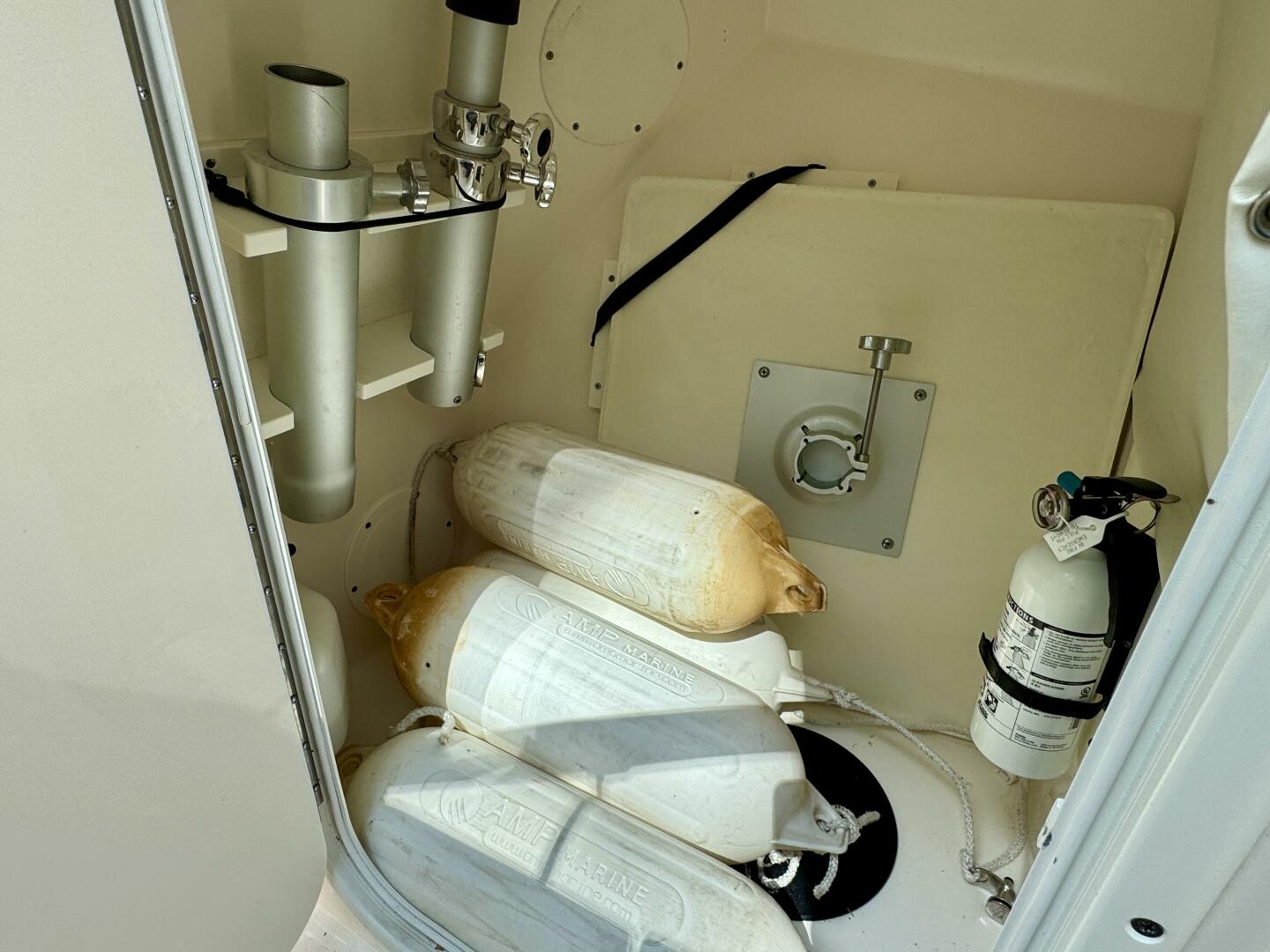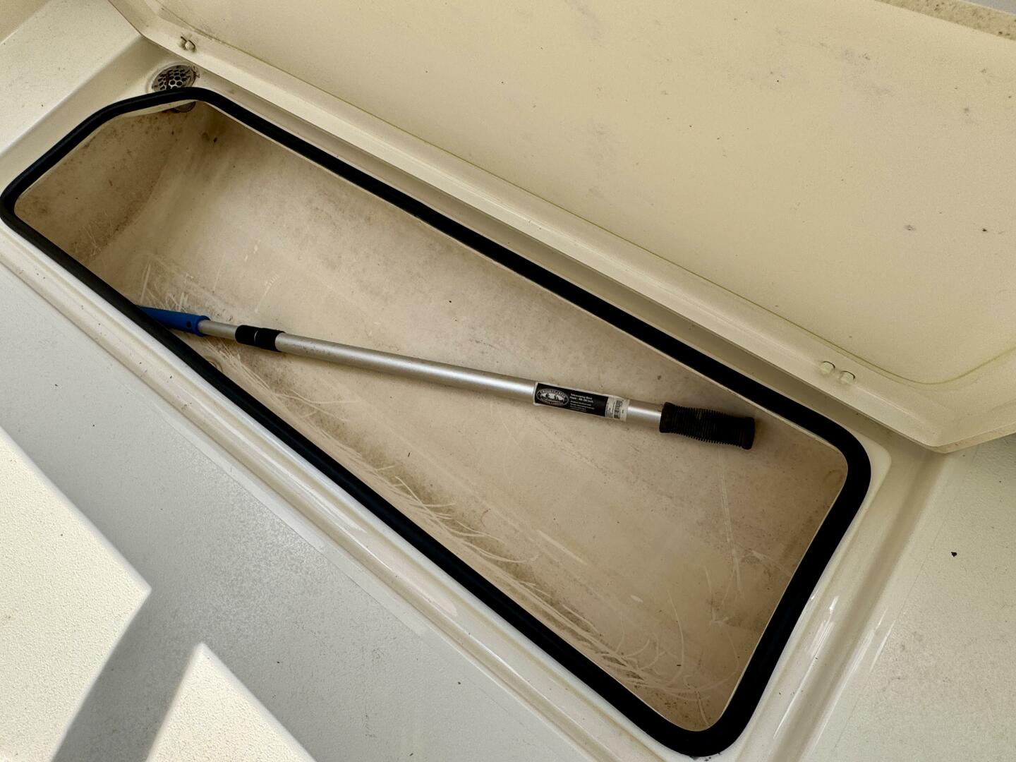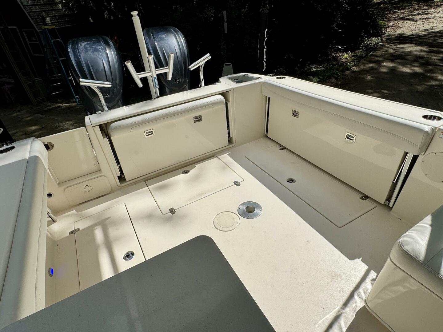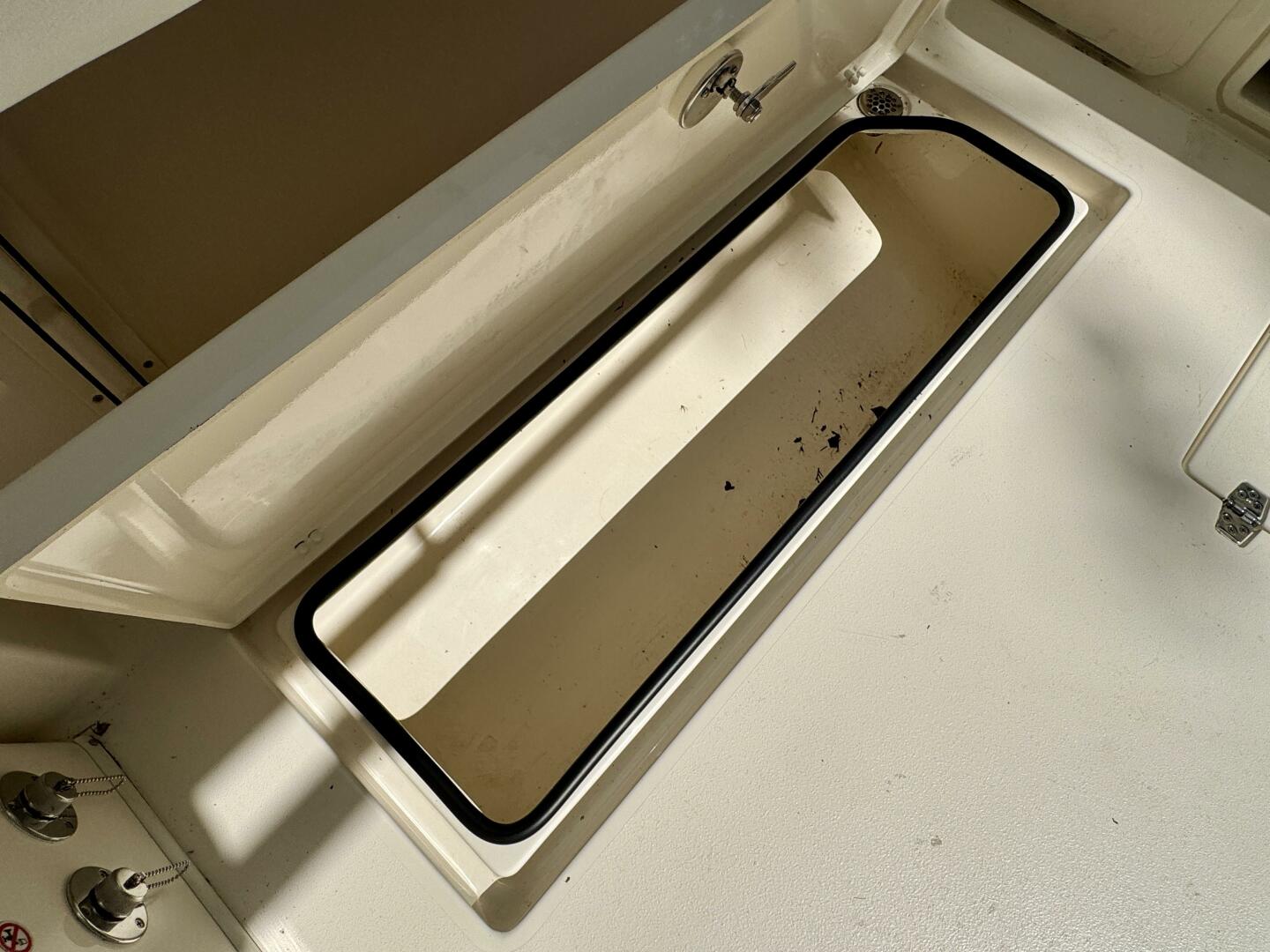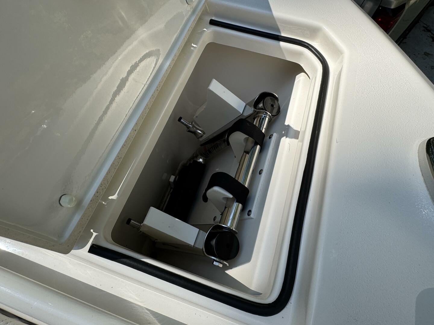Turning your focus towards the aft of the 45sqft of cockpit space you'll find rod storage for three rods under the starboard gunnel, a transom door, (5)rod holders across the transom, plus (3)removable rocket launchers/rod holders, a 25-gallon aerated livewell, underwater lights below the transom, another handheld shower at the transom next to your stern 4-step swim boarding ladder, (2)insulated fish boxes with macerator pumpouts underfoot (one to port and one to starboard), plus hideaway fold out seating at the transom and the port side when the fishing is done and you're ready to cruise.