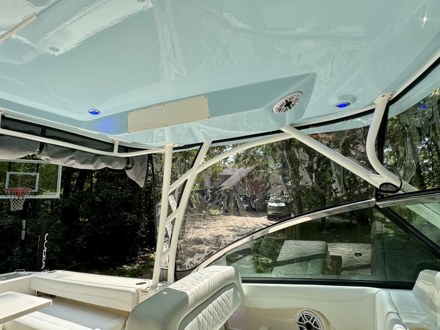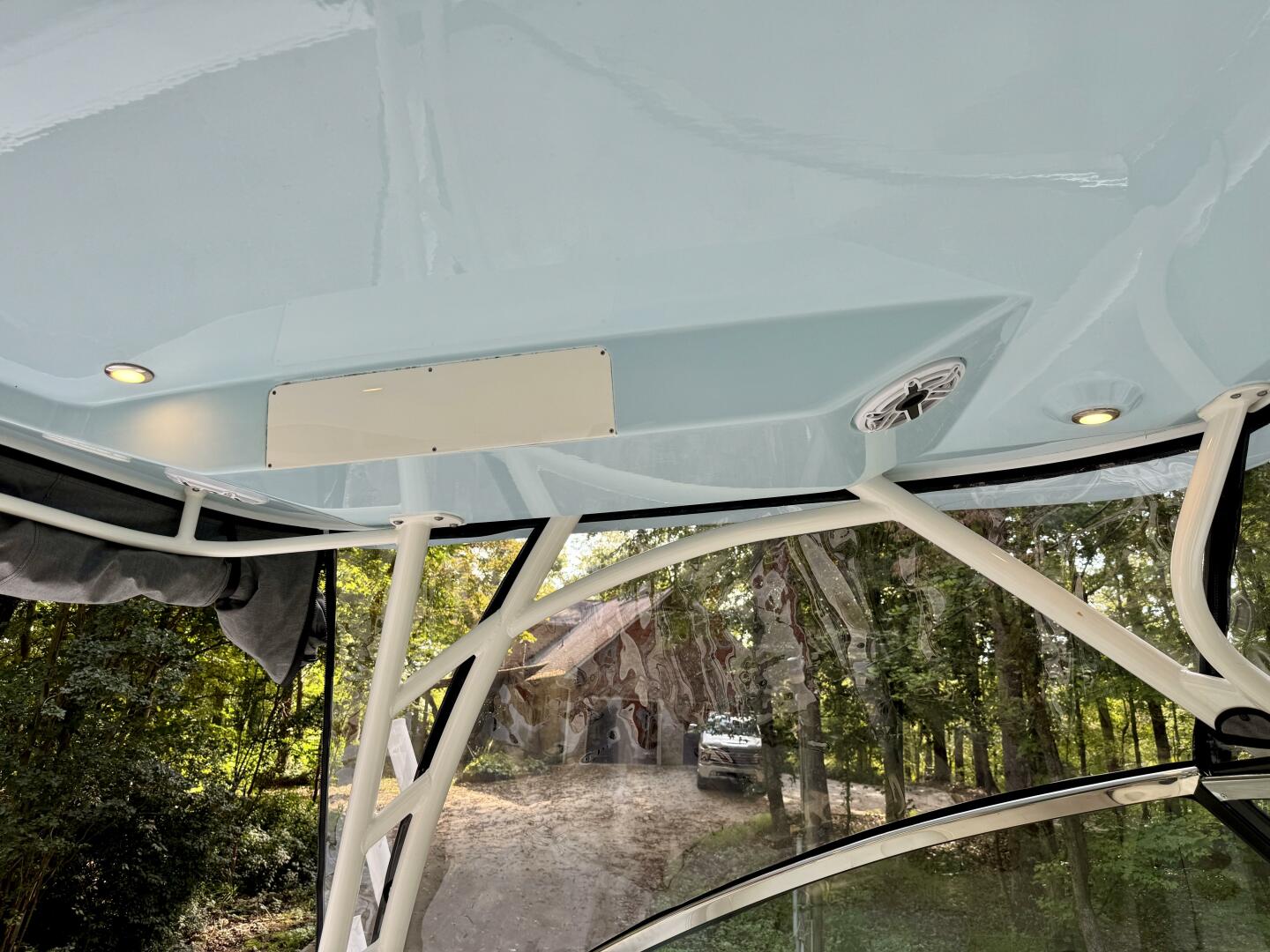 Overhead is a hard top with 2-tone gelcoat with powder coating package, an isinglass enclosure, forward/aft spreader lights, four of the eight cockpit speakers, integrated overhead lights, (6)rod holders, and a push-button electric full cockpit sunshade that extends from the hard top.